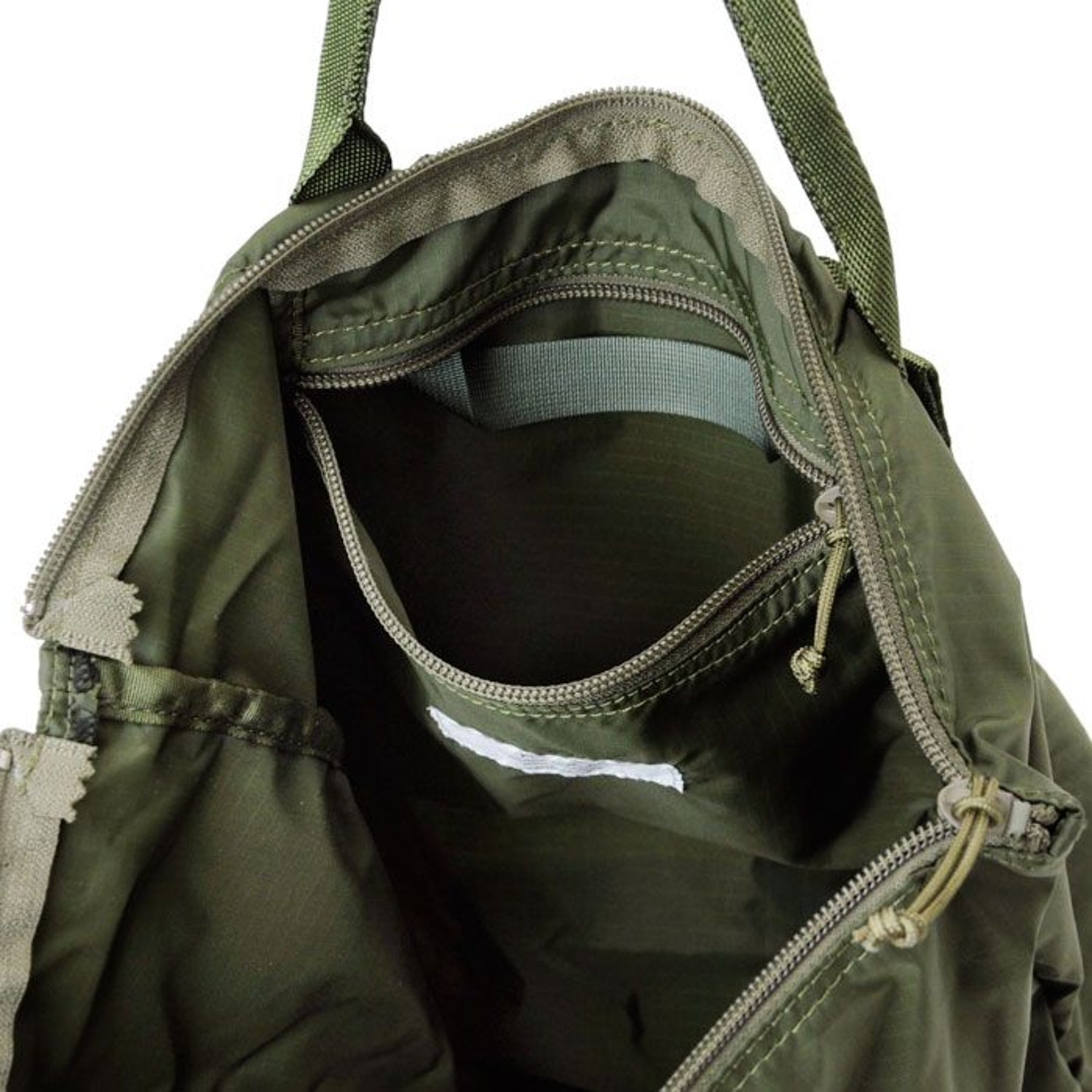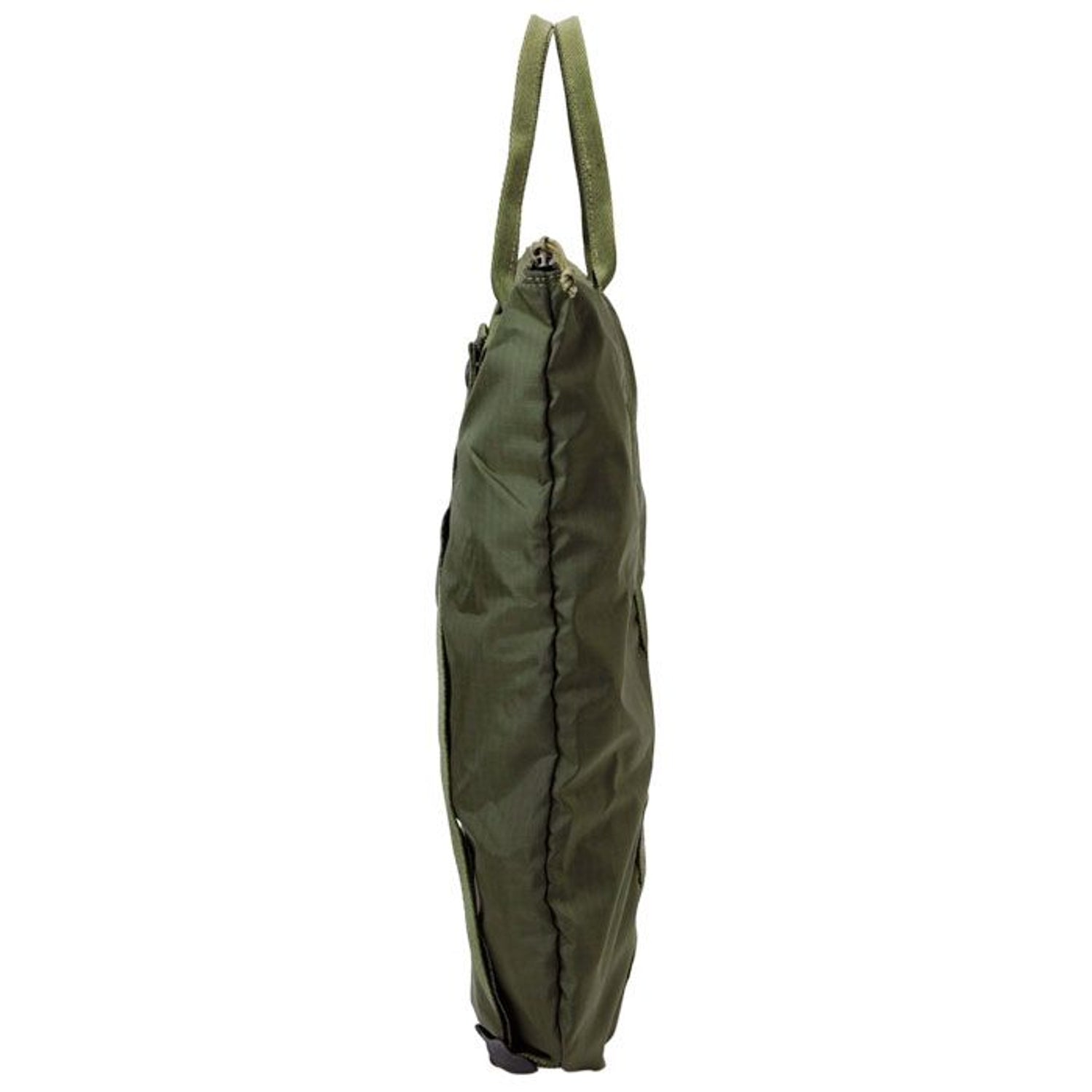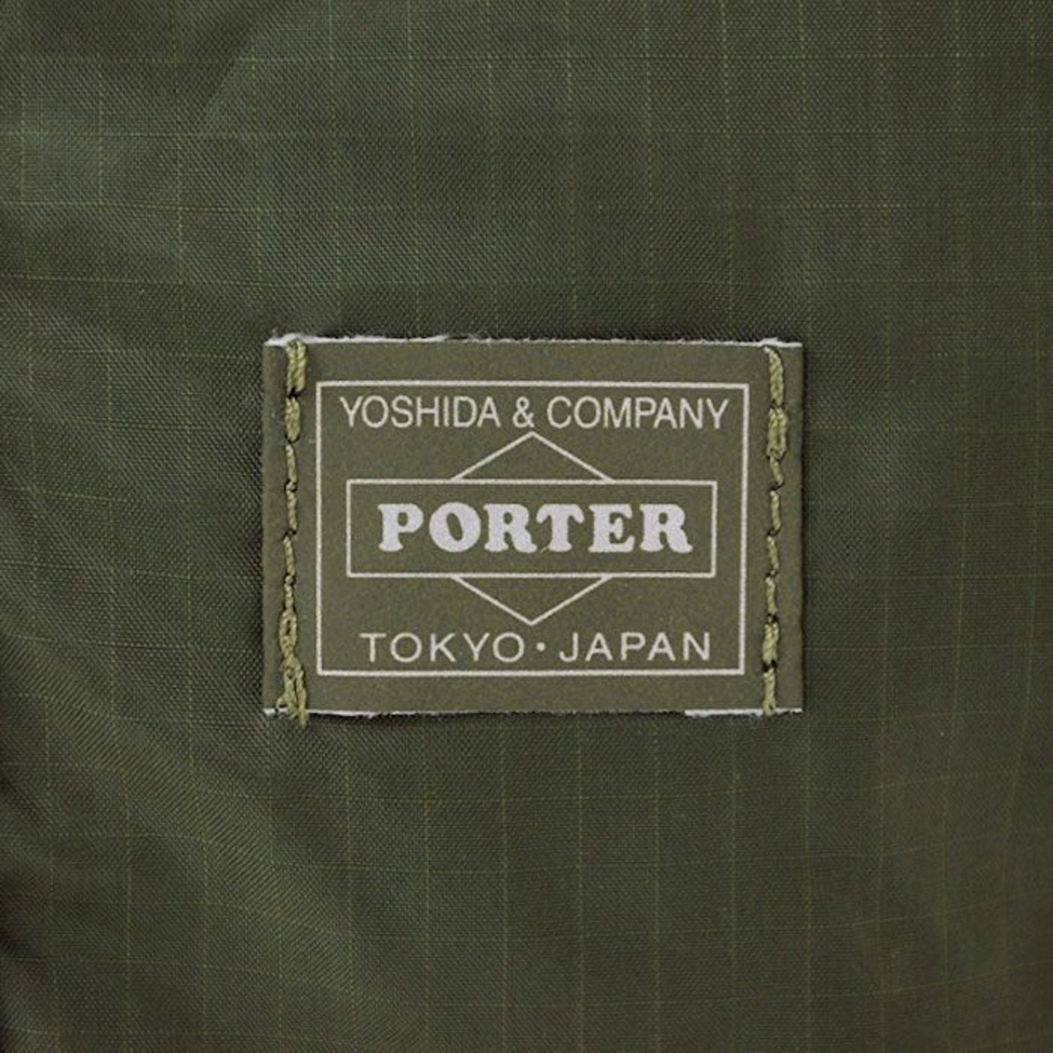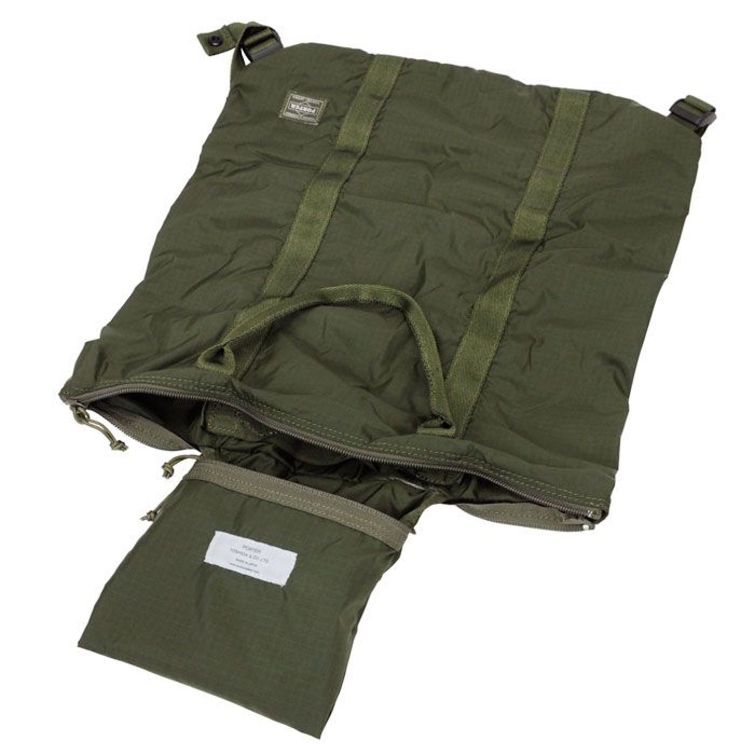 A lightweight, packable tote from the PORTER FLEX series, designed for maximum portability and everyday versatility. Made from durable nylon ripstop—also known as parachute cloth—the fabric uses a grid of thick nylon threads to prevent tears from spreading, a construction borrowed from military ponchos and outdoor gear. To maintain a flat, foldable design, the bag features no three-dimensional pockets and uses plastic hardware instead of metal, keeping the weight extremely low. A reflective name tag provides a functional military-inspired detail.