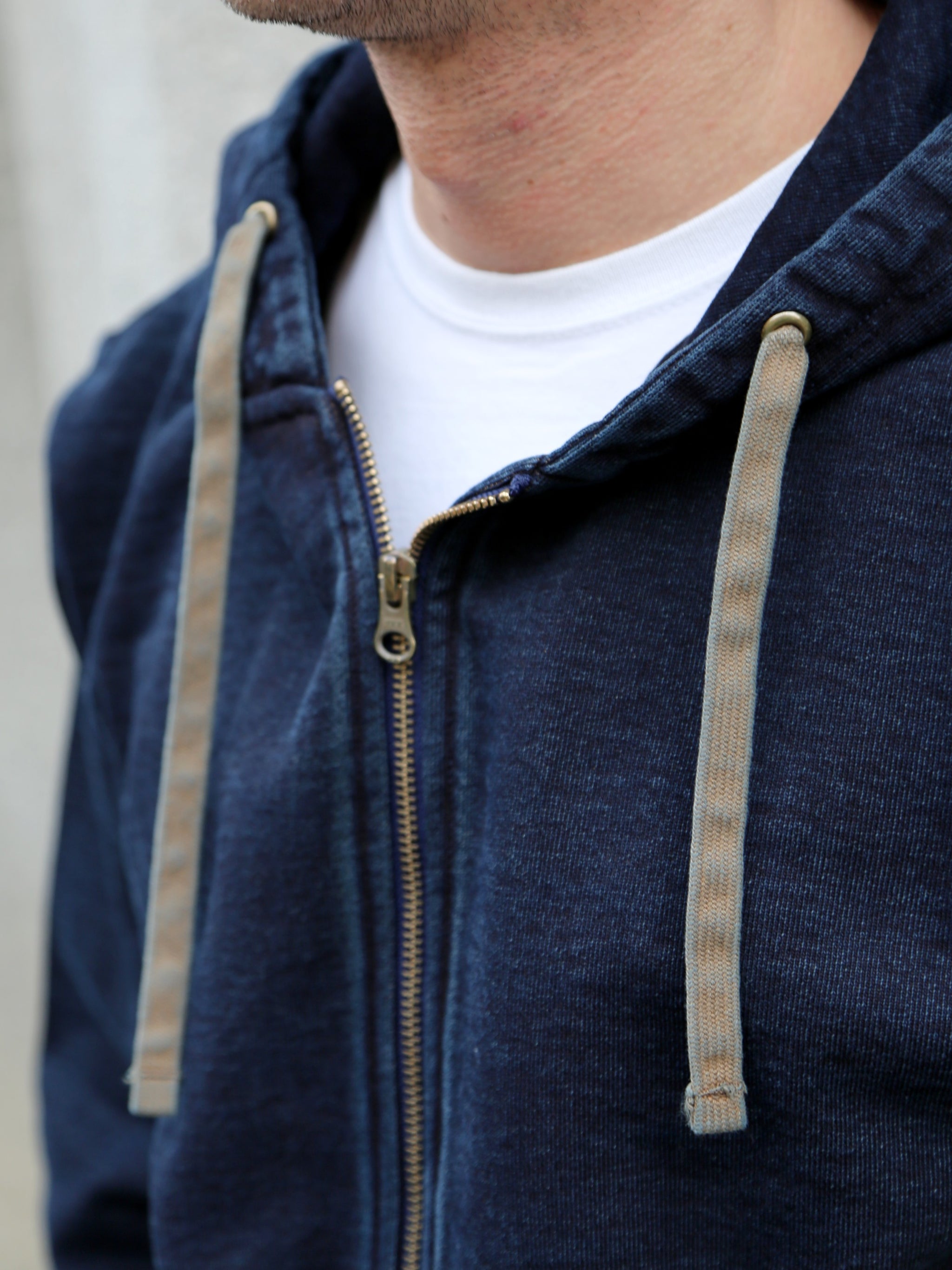 The fabric for Samurai's latest sweatshirt offering is a heavyweight sweat knit, densely woven using 30-count yarns that have been rope-dyed in Natural indigo. These yarns contain small pockets of air within the fibers, giving the fabric a dry, textured feel and a rugged appearance that will develop character over time.