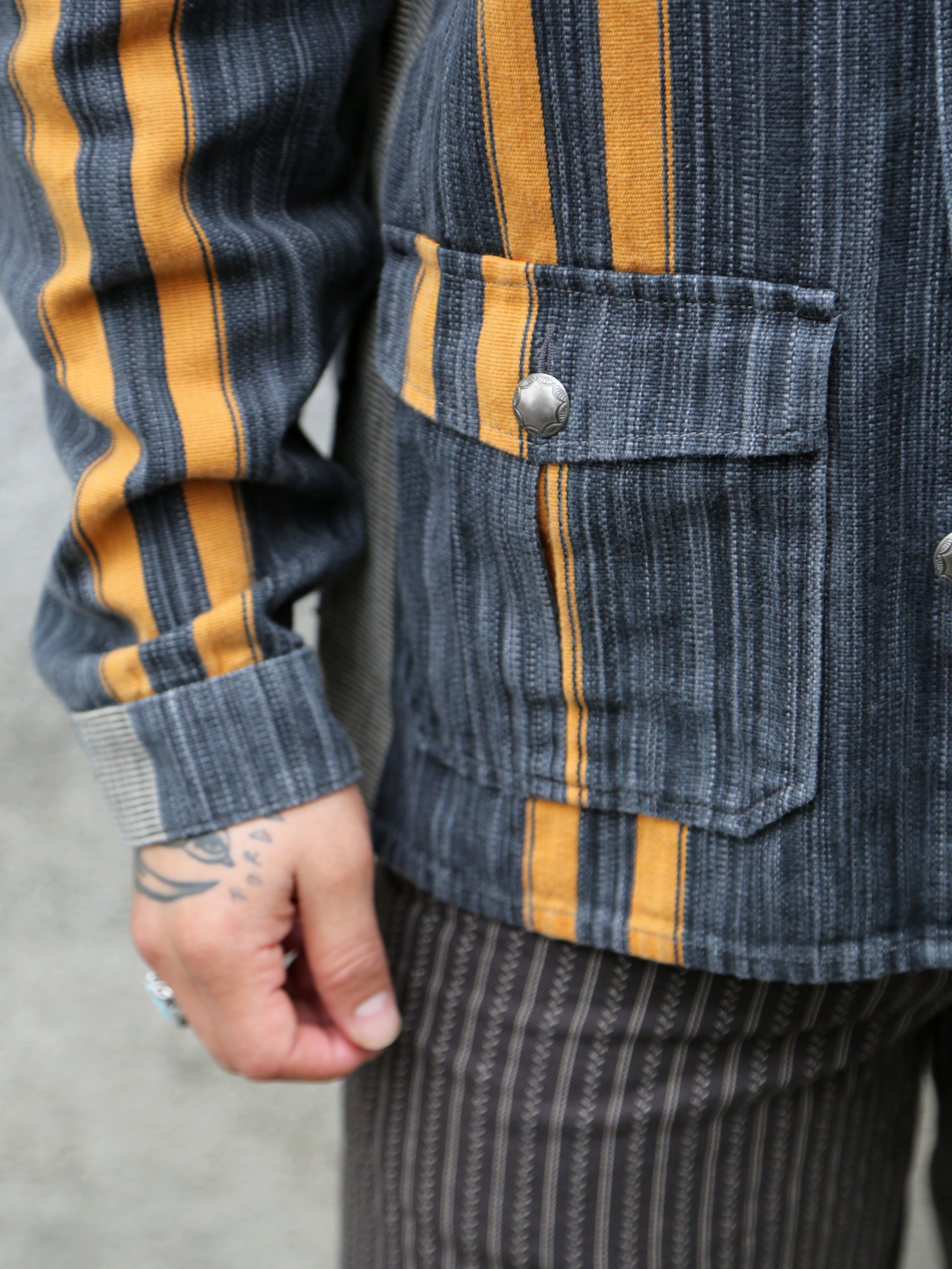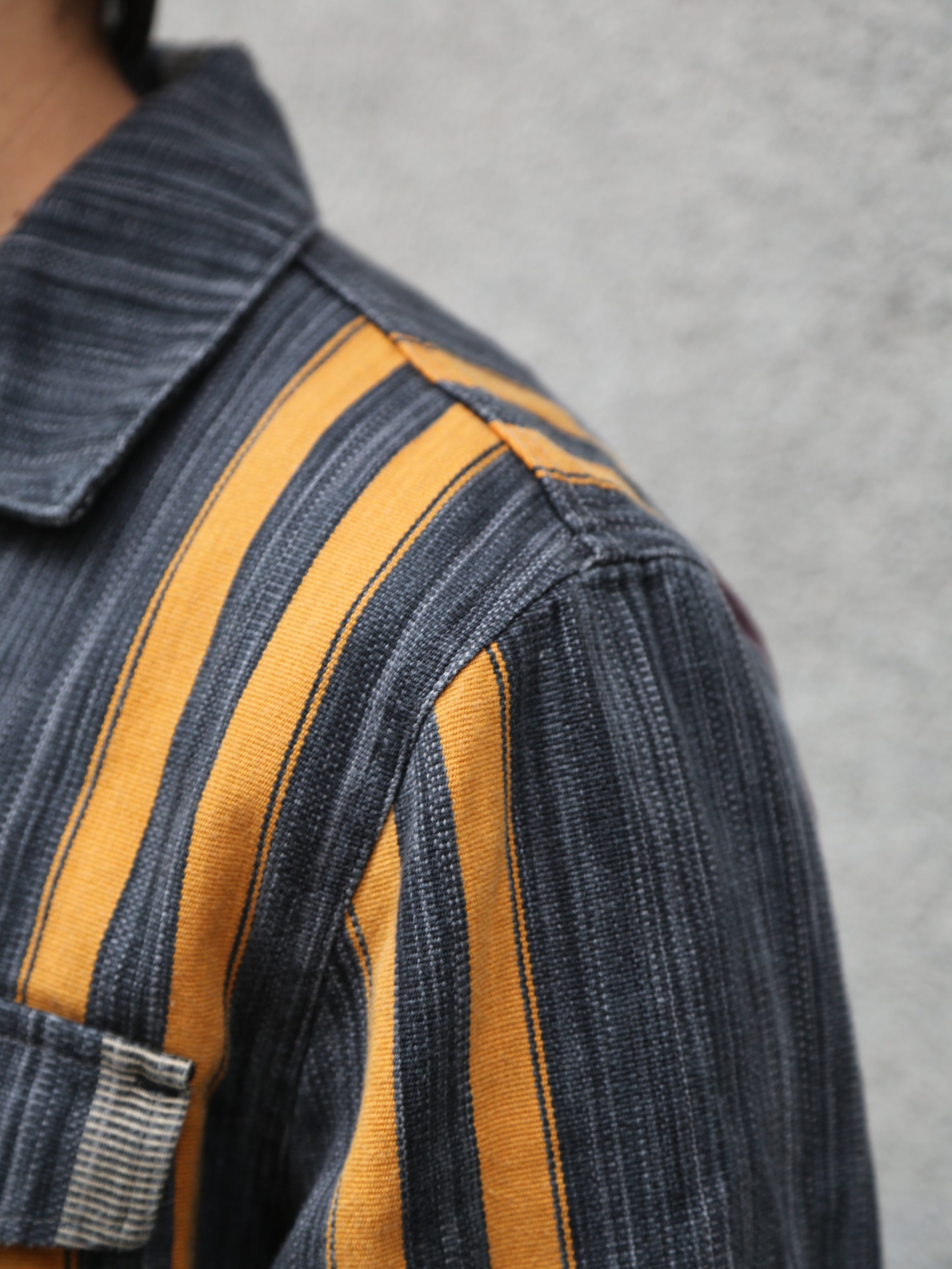 Chore coat cut from a stripe pattern cotton and wool fabric. Woven in Japan on narrow shuttle looms. Additional details include metal concho buttons and two patch pockets on front.