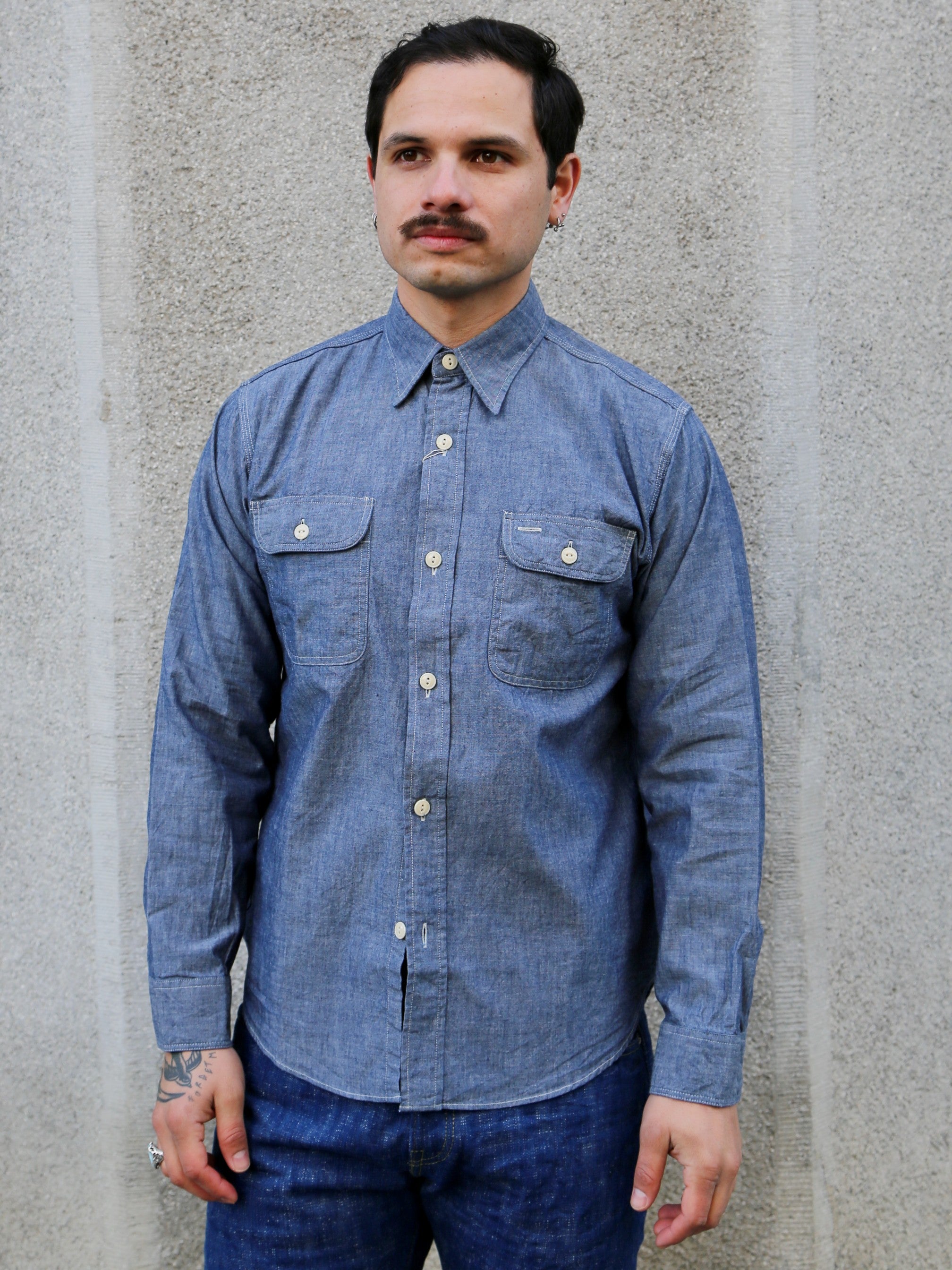 A chambray shirt is an essential item in American casual wear. It's based on a 1950s item, and the tough construction with winding stitching using a three-needle sewing machine gives it a workwear-like finish. Both chest pocket are with flaps (pen holder on the left).
