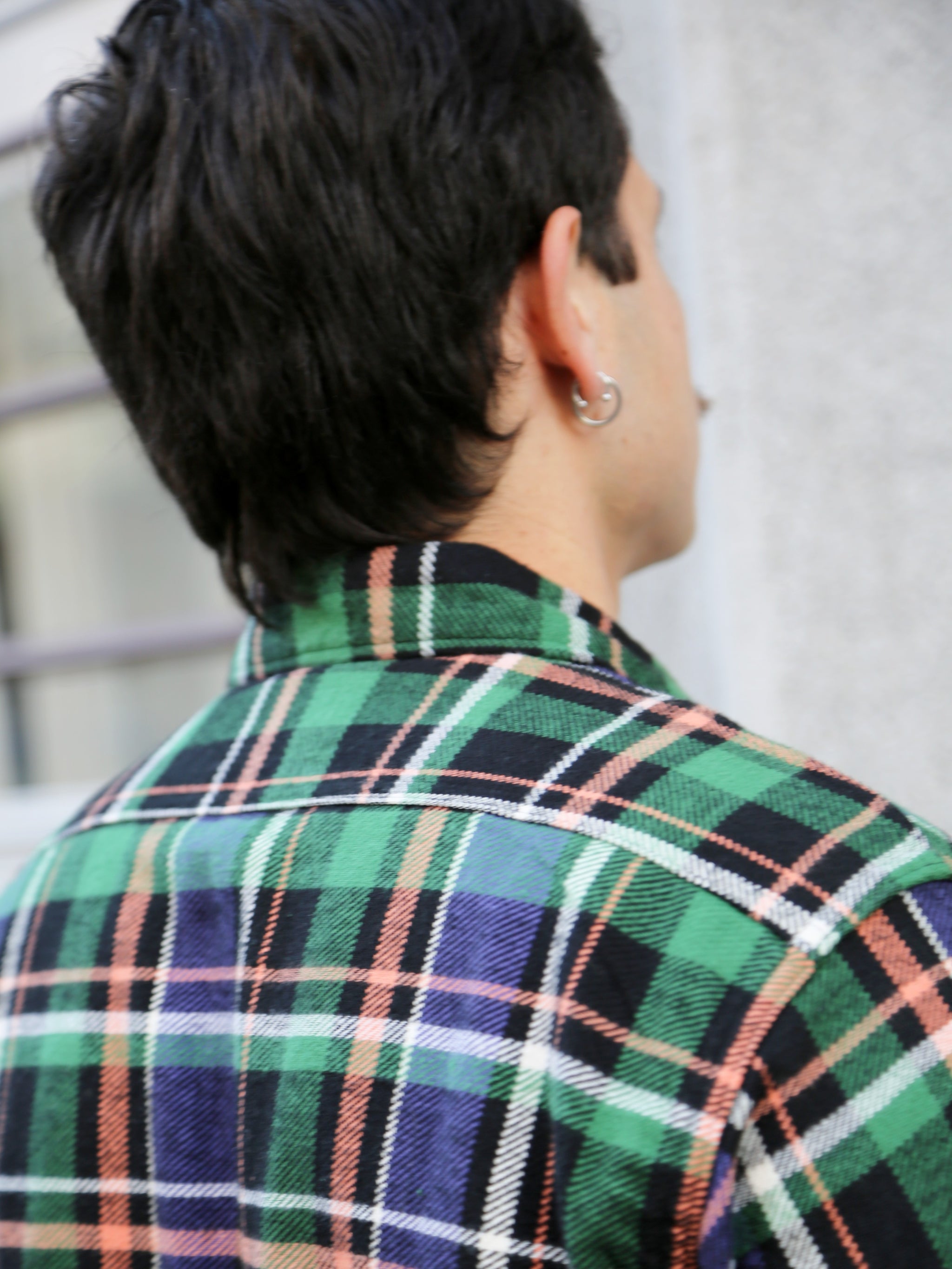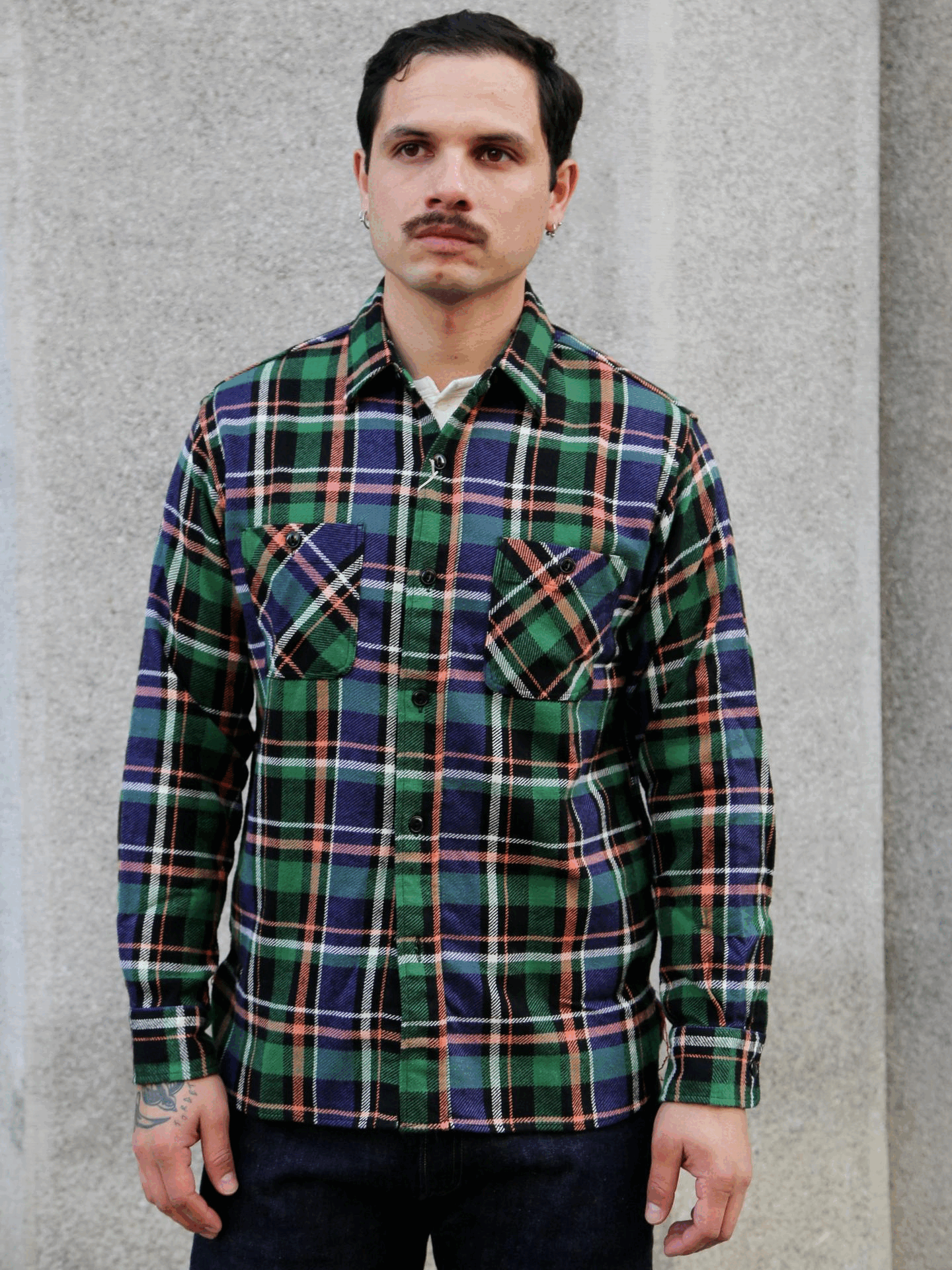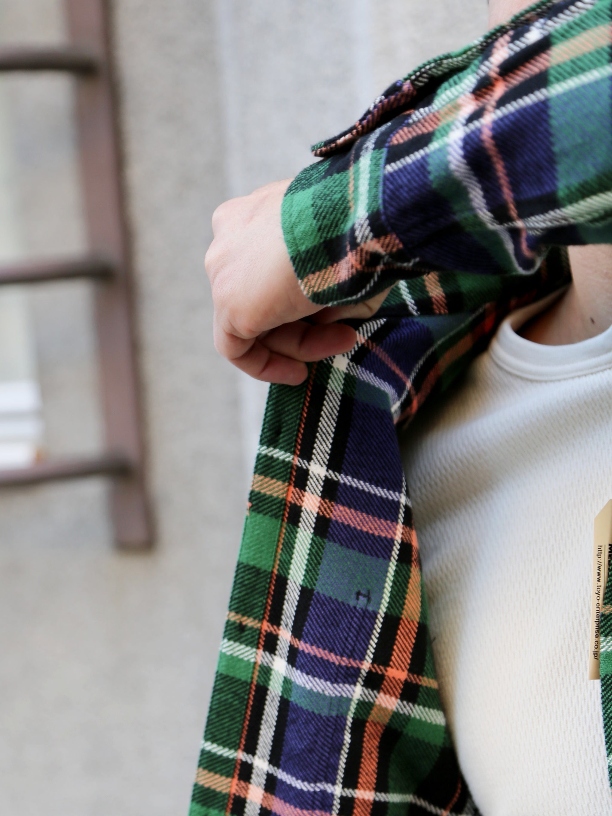 The beautifully colored check pattern is inspired by the 1980s Winter Run work shirts. With five warp and four weft colors, comes in the navy colorway, inspired by K mart's wool CPO shirt and Mr. Leggs' cotton work shirt.