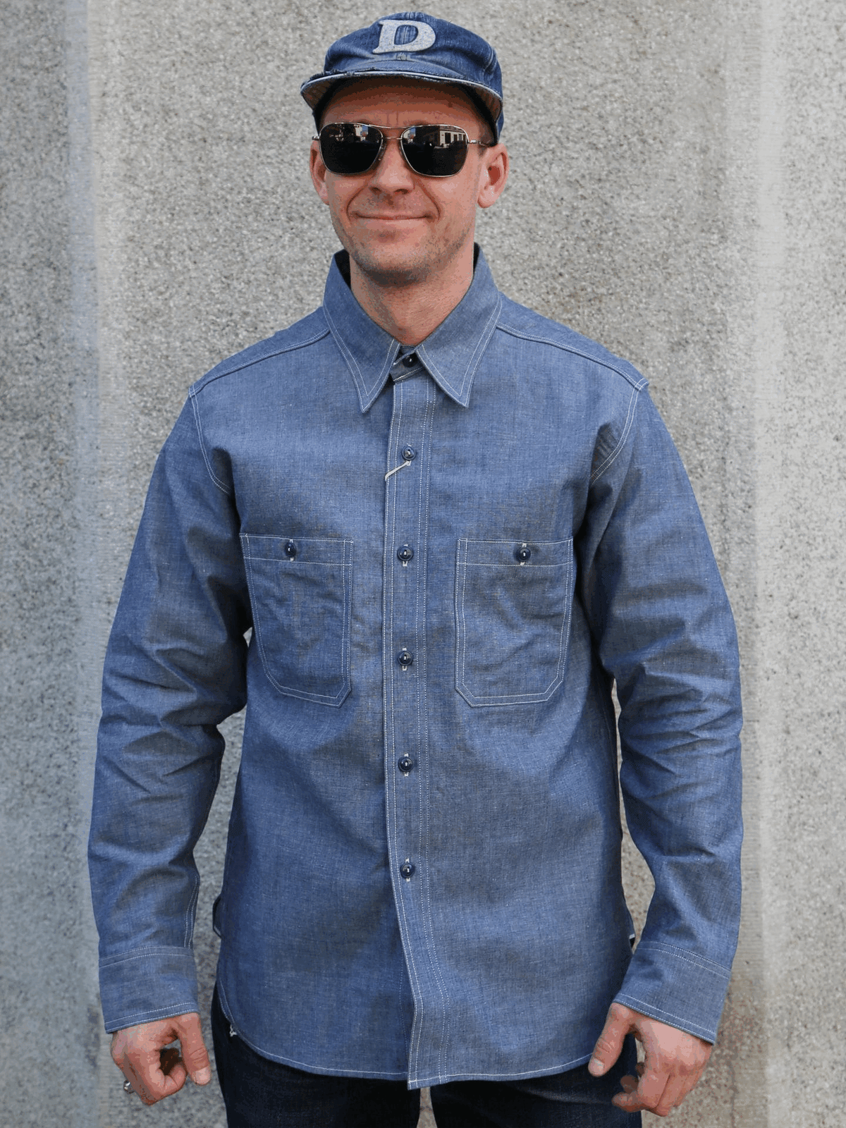 The U.S. NAVY CHAMBRAY SHIRT L/S (MODIFY) is constructed from a lightweight 5oz cotton chambray, featuring navy blue urea buttons, selvedge gusseted hem and symmetrical buttoned patch pockets to the chest. The collar structure accurately recreates the elegant profile of Navy shirts, while the cuffs are broader than those found on most shirts, a feature believed to facilitate the rolling up of the sleeves.