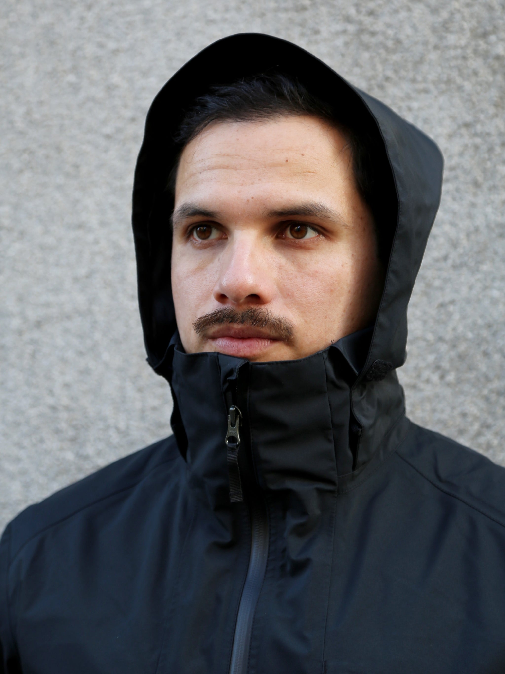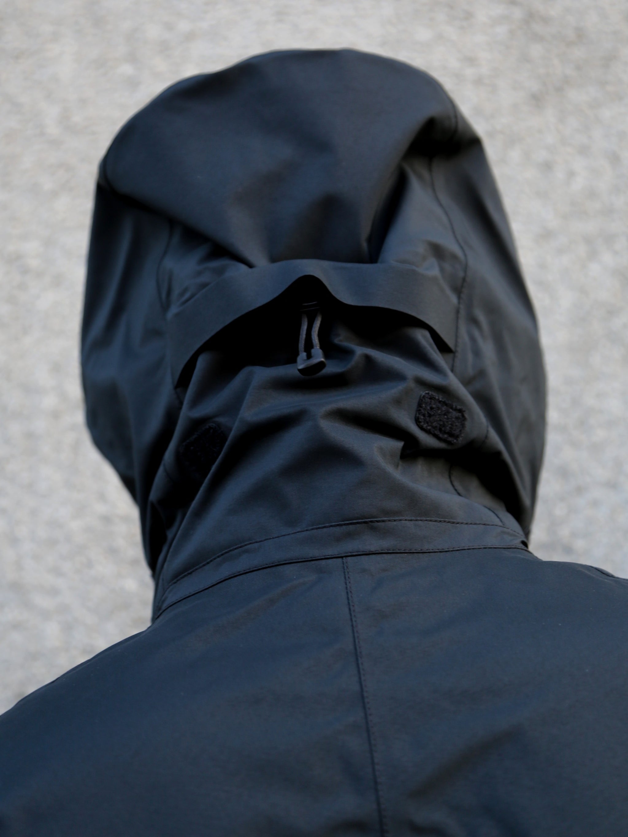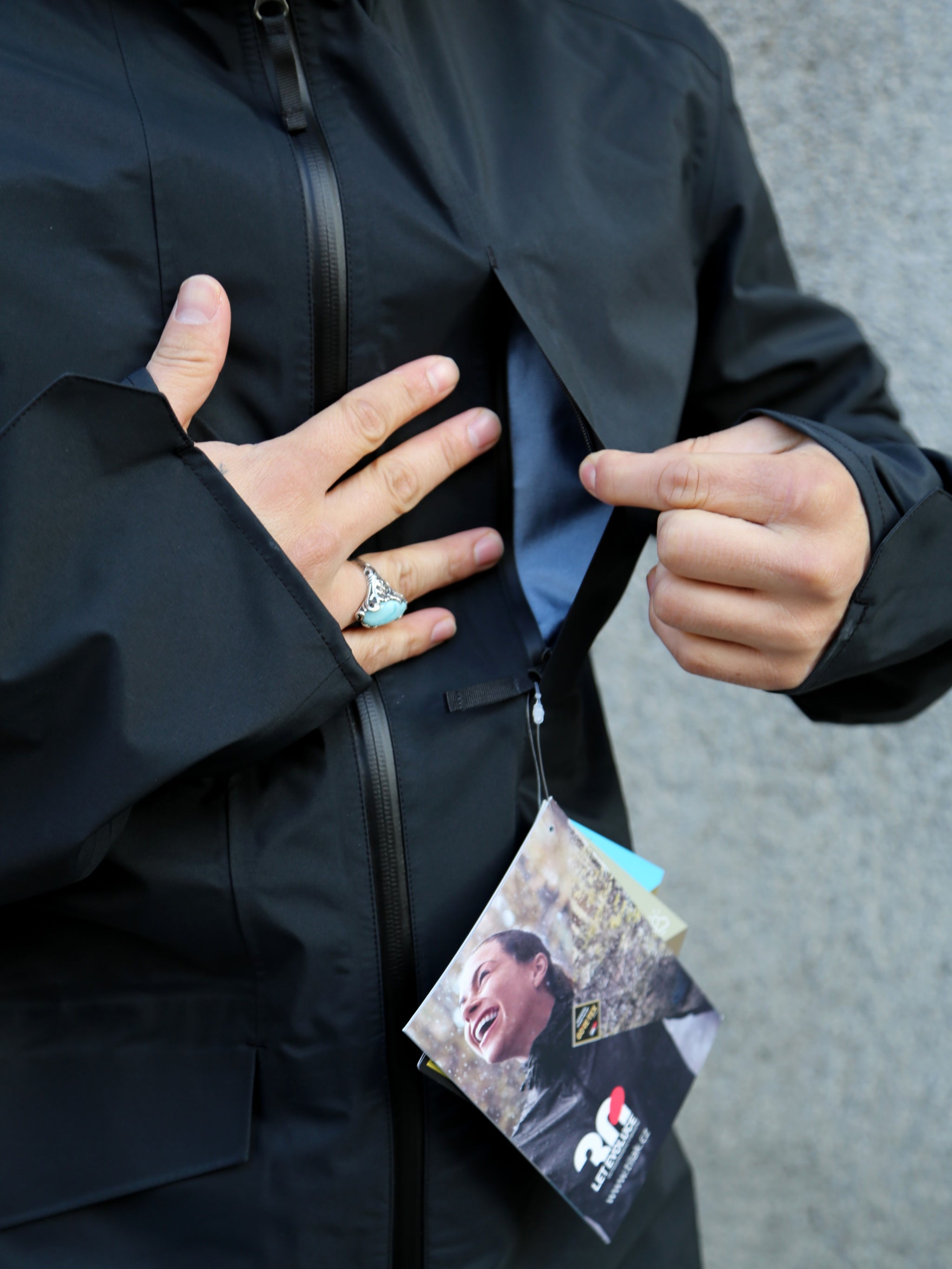 Coat made of three-layer GORE-TEX® material, with seams taped with narrow 13 mm "Micro Tape". The front zipper is two-way and waterproof. Anatomically shaped sleeves and a packable hood. External chest zipper pocket, internal chest zipper pocket, larger internal mesh pocket, lower pockets with double entry (side entry - waterproof zipper, upper entry covered by a flap), small zippered pocket on the left sleeve.