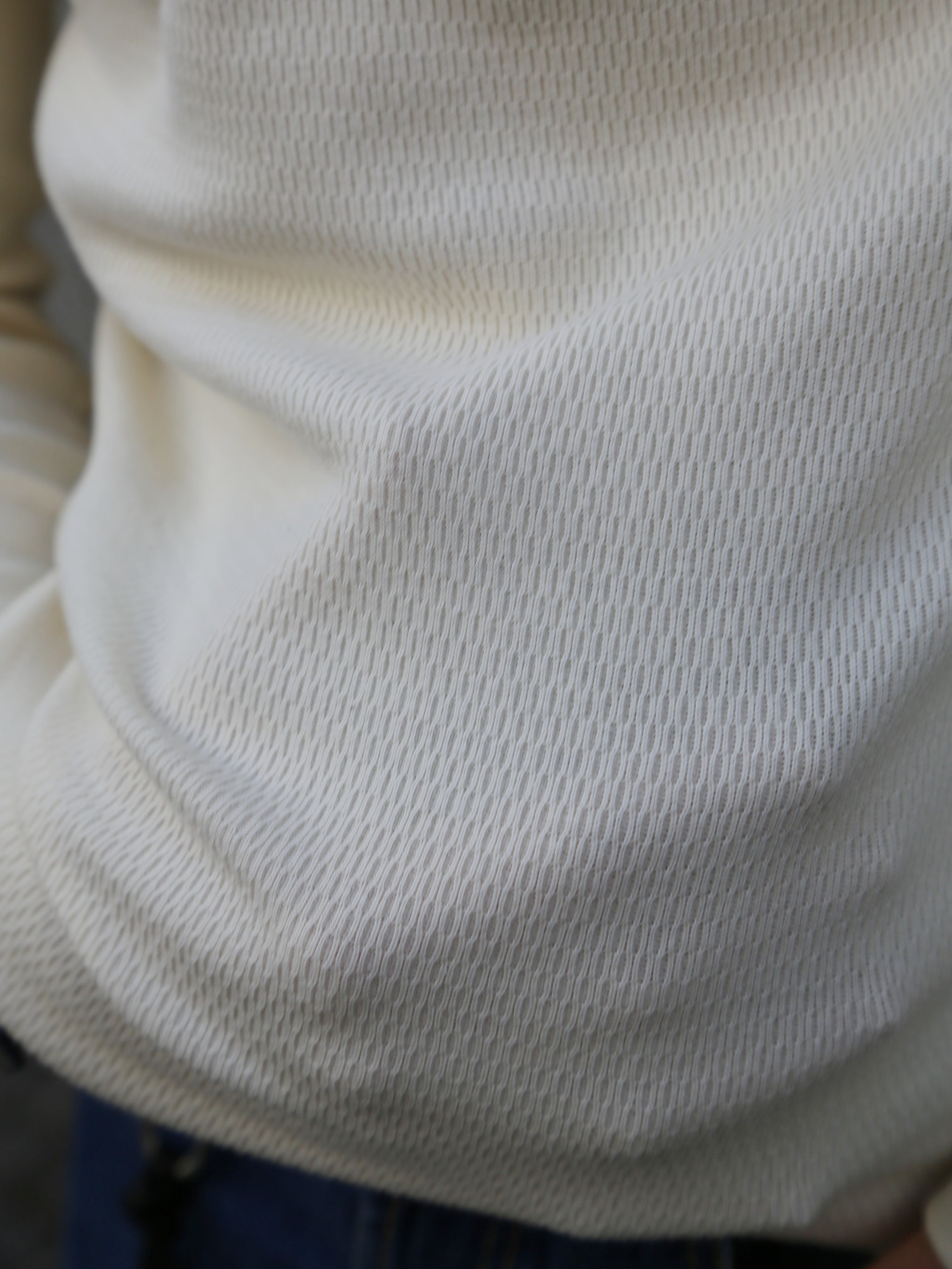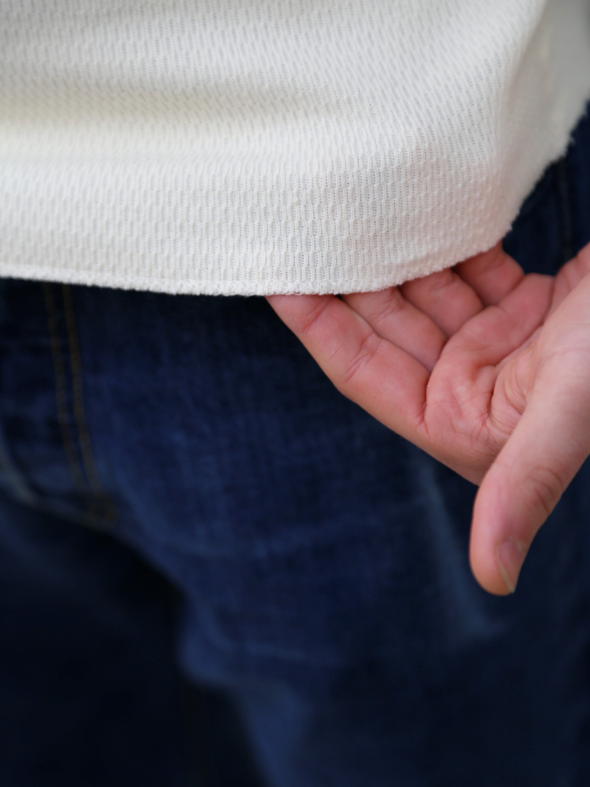 By using air-spun yarn, they have emphasized the crisp feel and created a casual finish. The finishing process gives the fabric a fluffy texture, and the more you wear it, the more vintage it becomes. You can feel the texture.