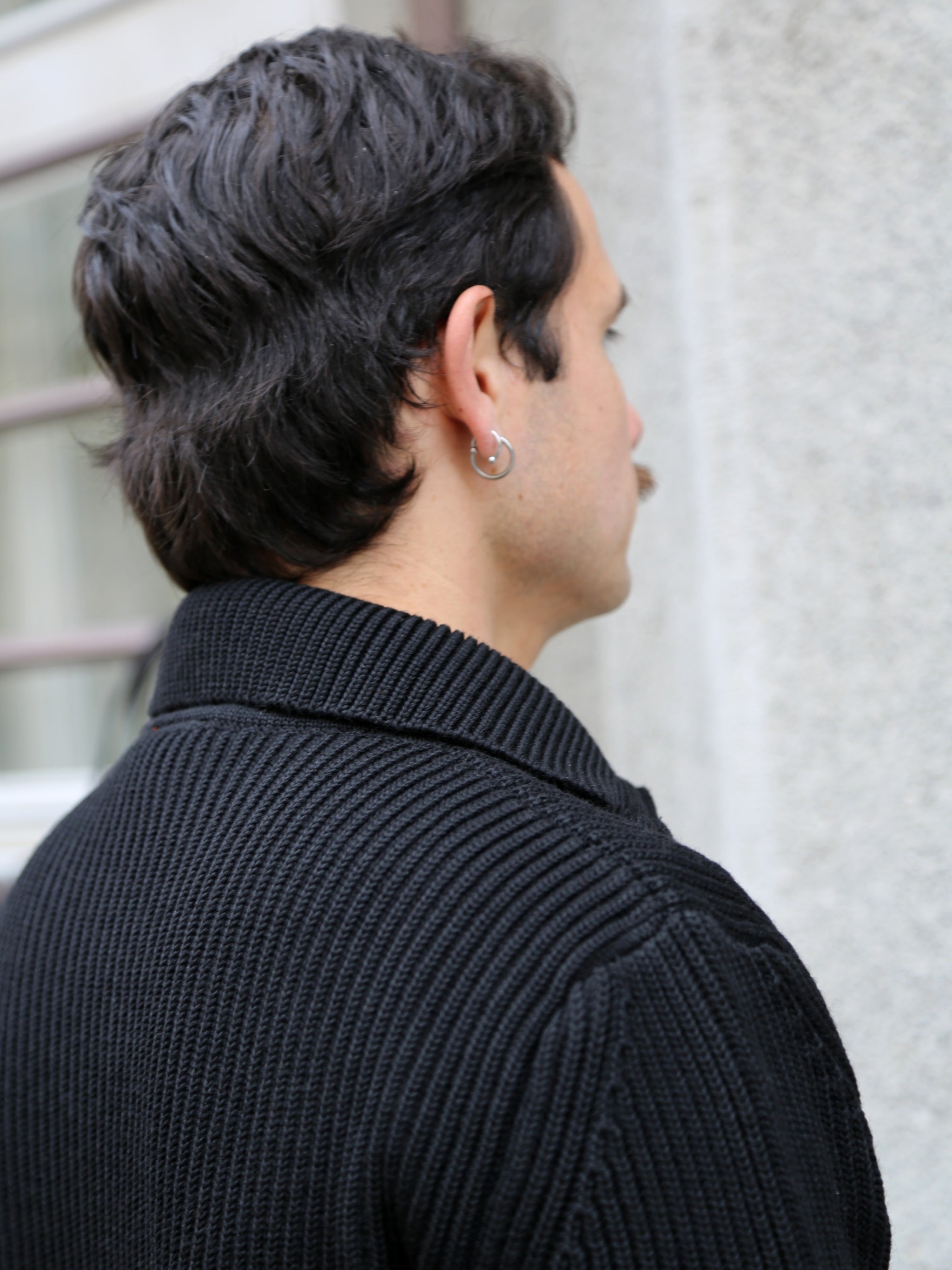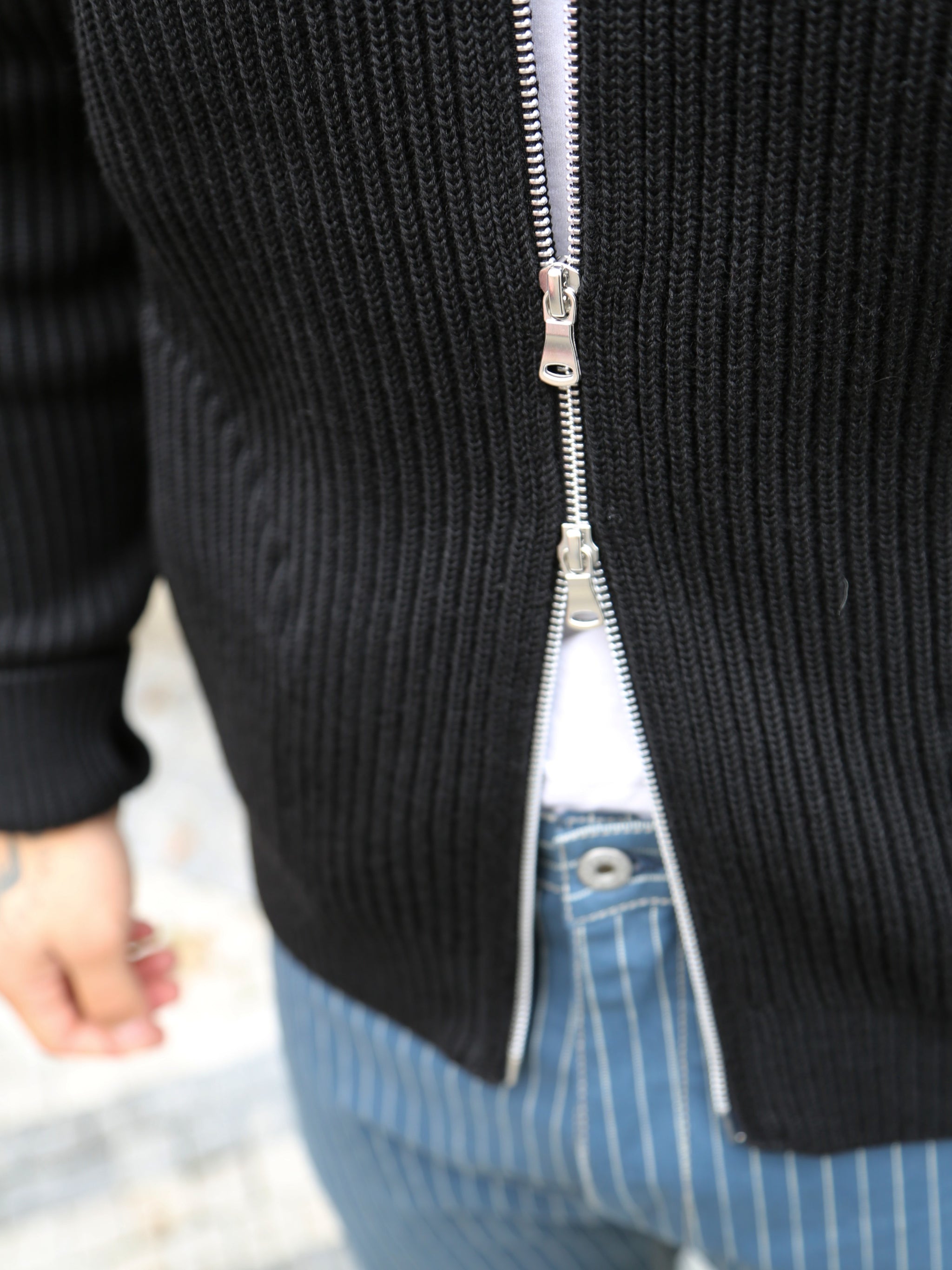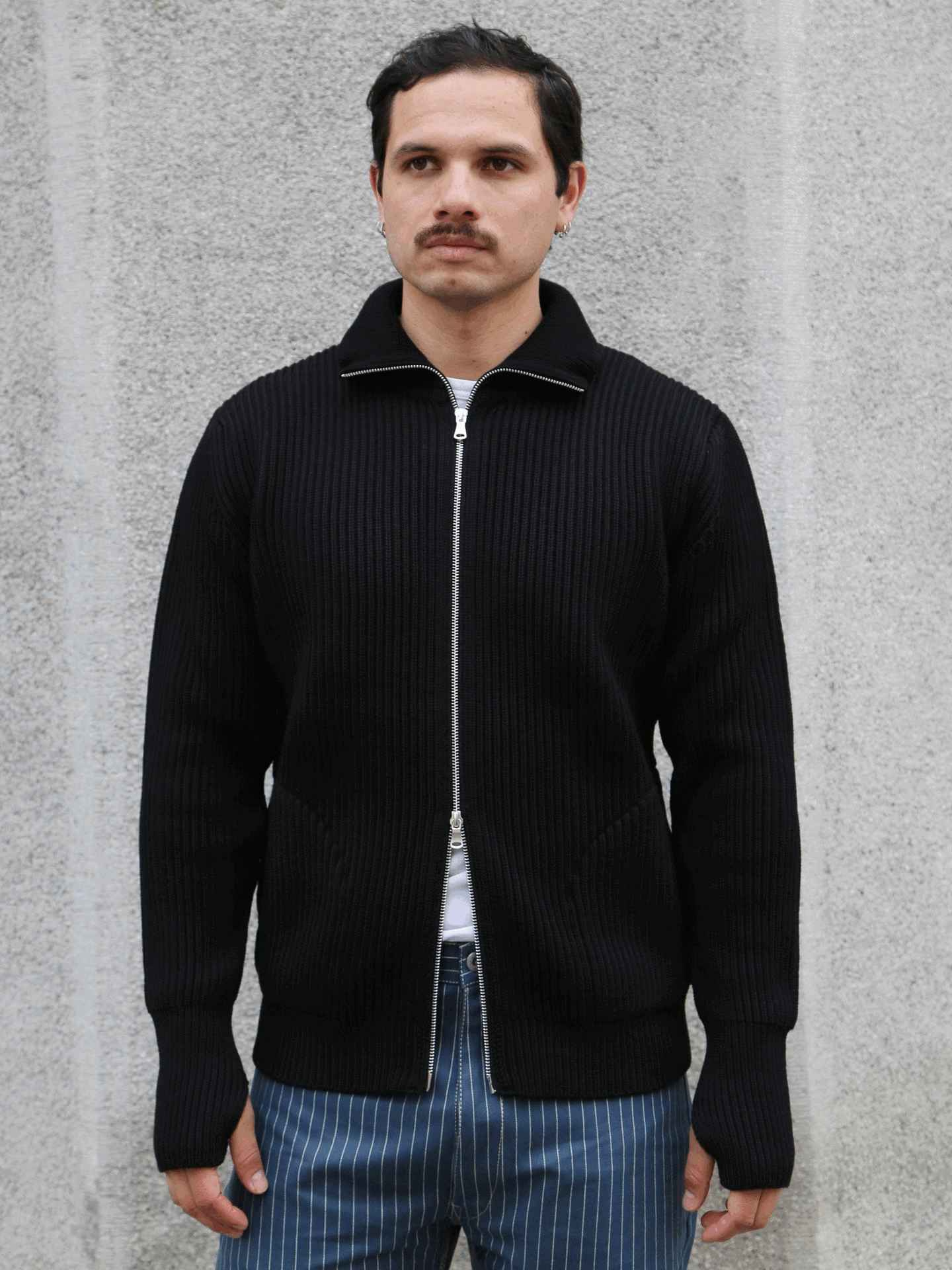 The Navy Full-zip Pockets is knitted compact, fully fashioned, on a flat knit machine.