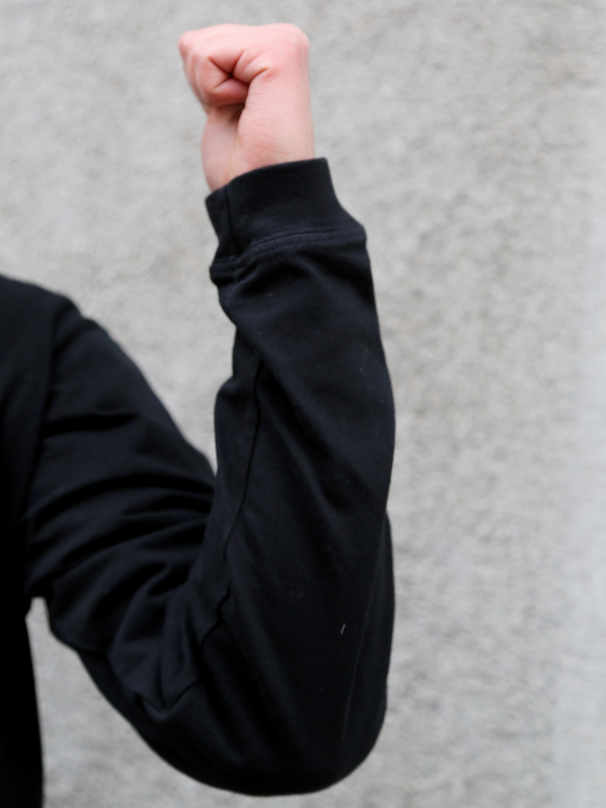 The neck rib is made with a twin-needle binder neck that resists stretch, and the cuffs are also ribbed for a snug fit.