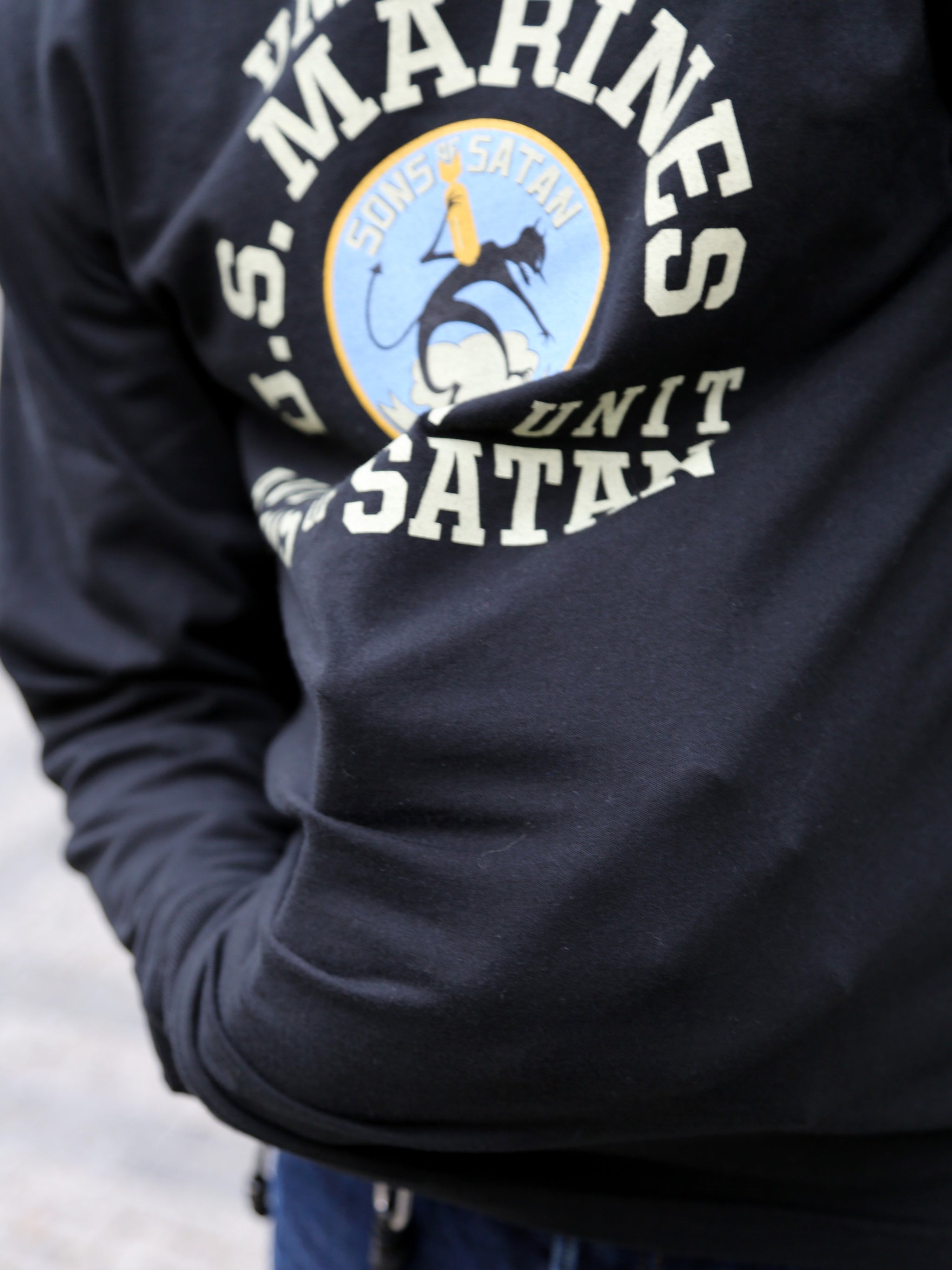 The front features a striking print of the unit's insignia and logo, featuring a sinister, black shadow devil in the center.