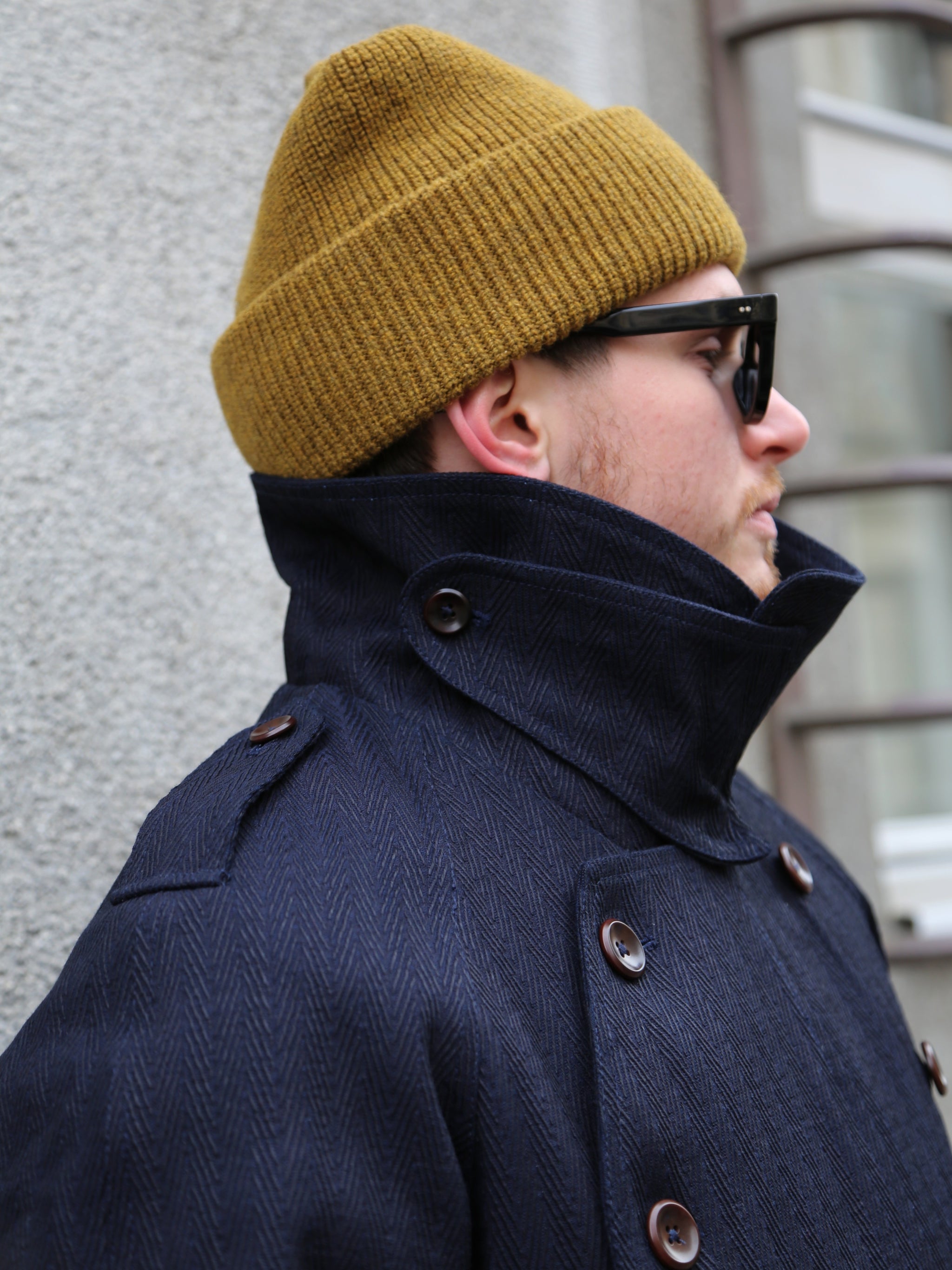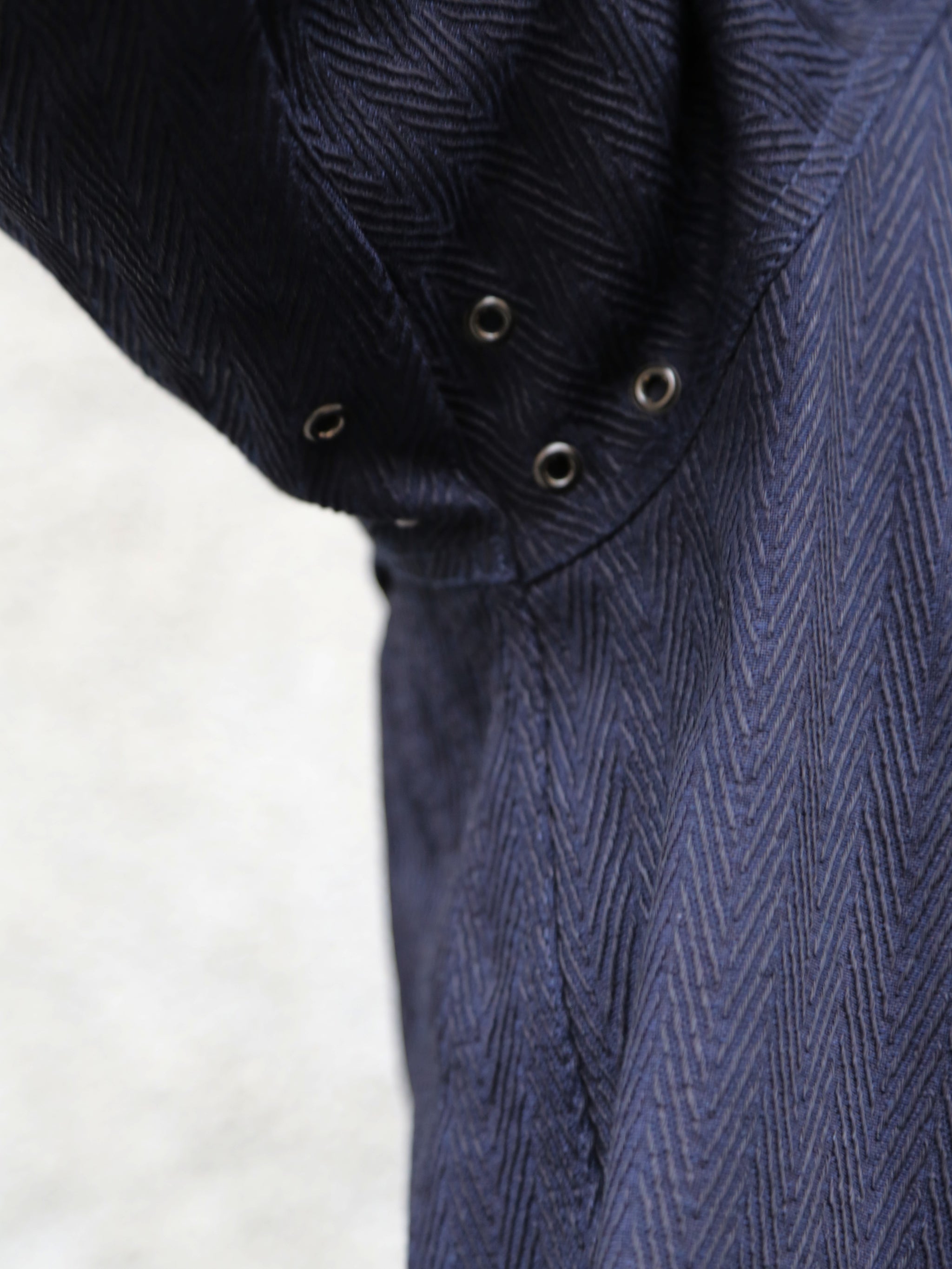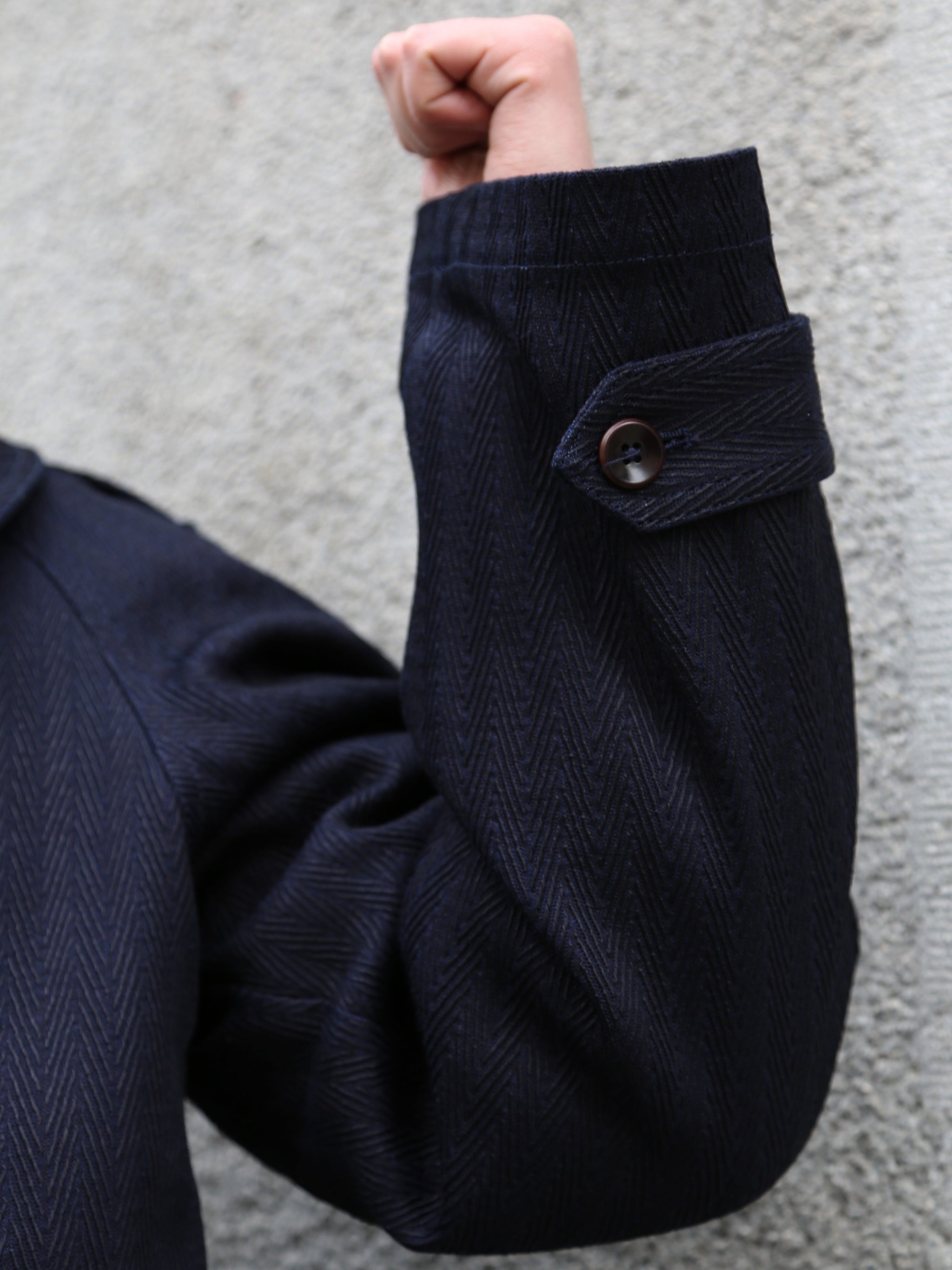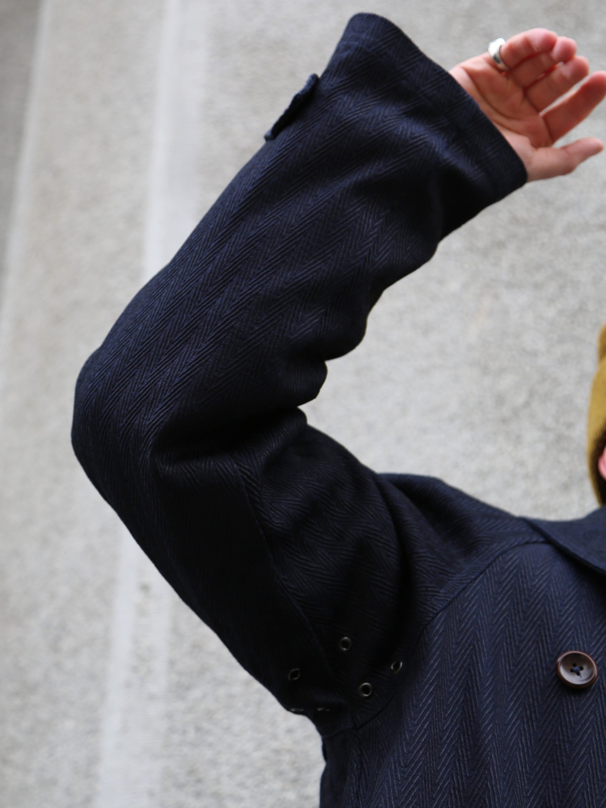 This overcoat, in large canvas HBT Sashiko INDIGO cotton from the KUROKI Manufacture in Japan is inspired by’ a 1938 model, specially designed for motorcyclists the French Army.