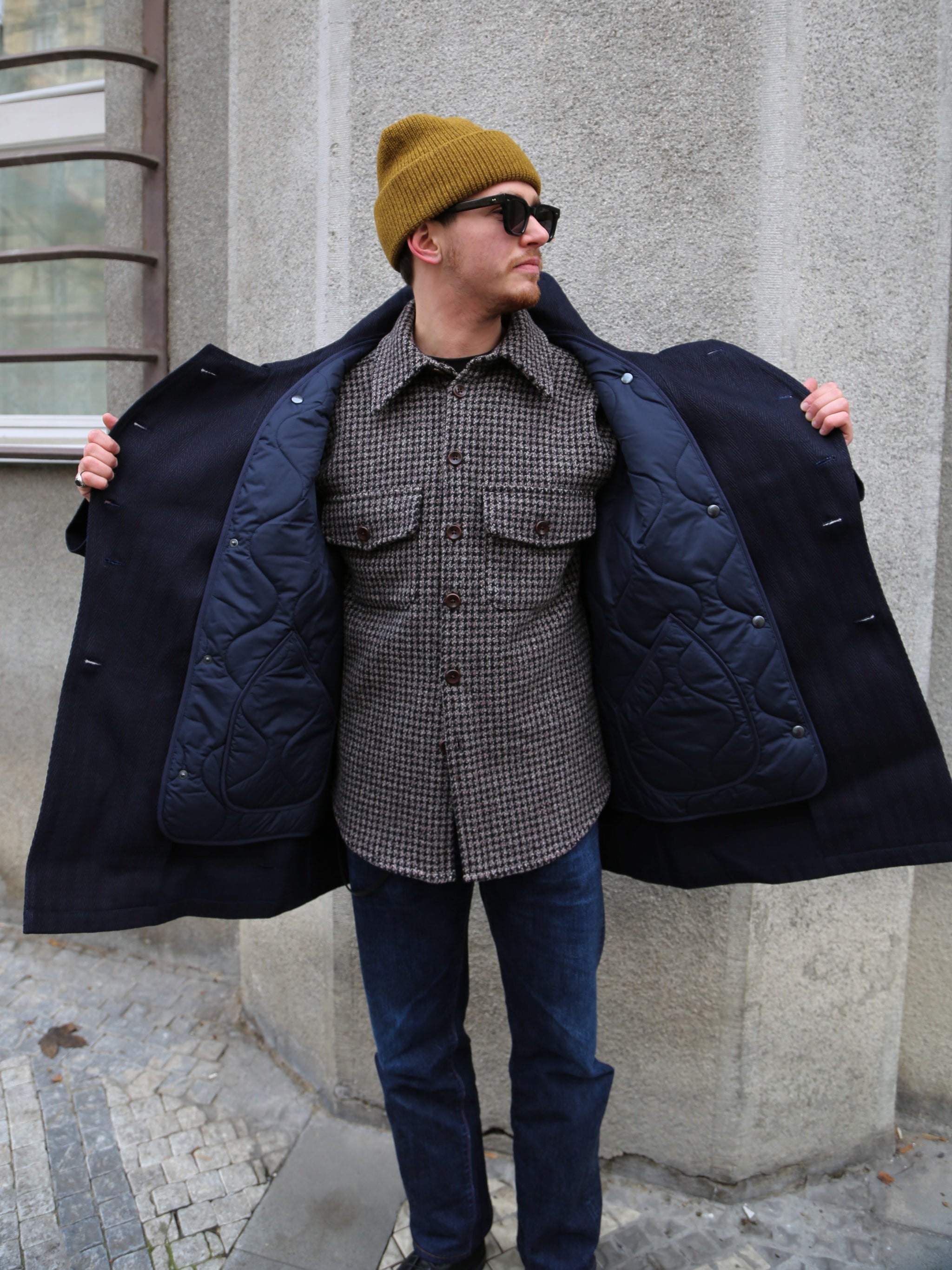 A overcoat is a jacket worn over other clothing. It is generally quite short, buttoned at the front, with patch pockets. The weave of the canvas is ultra dense which allows low wind penetration.
