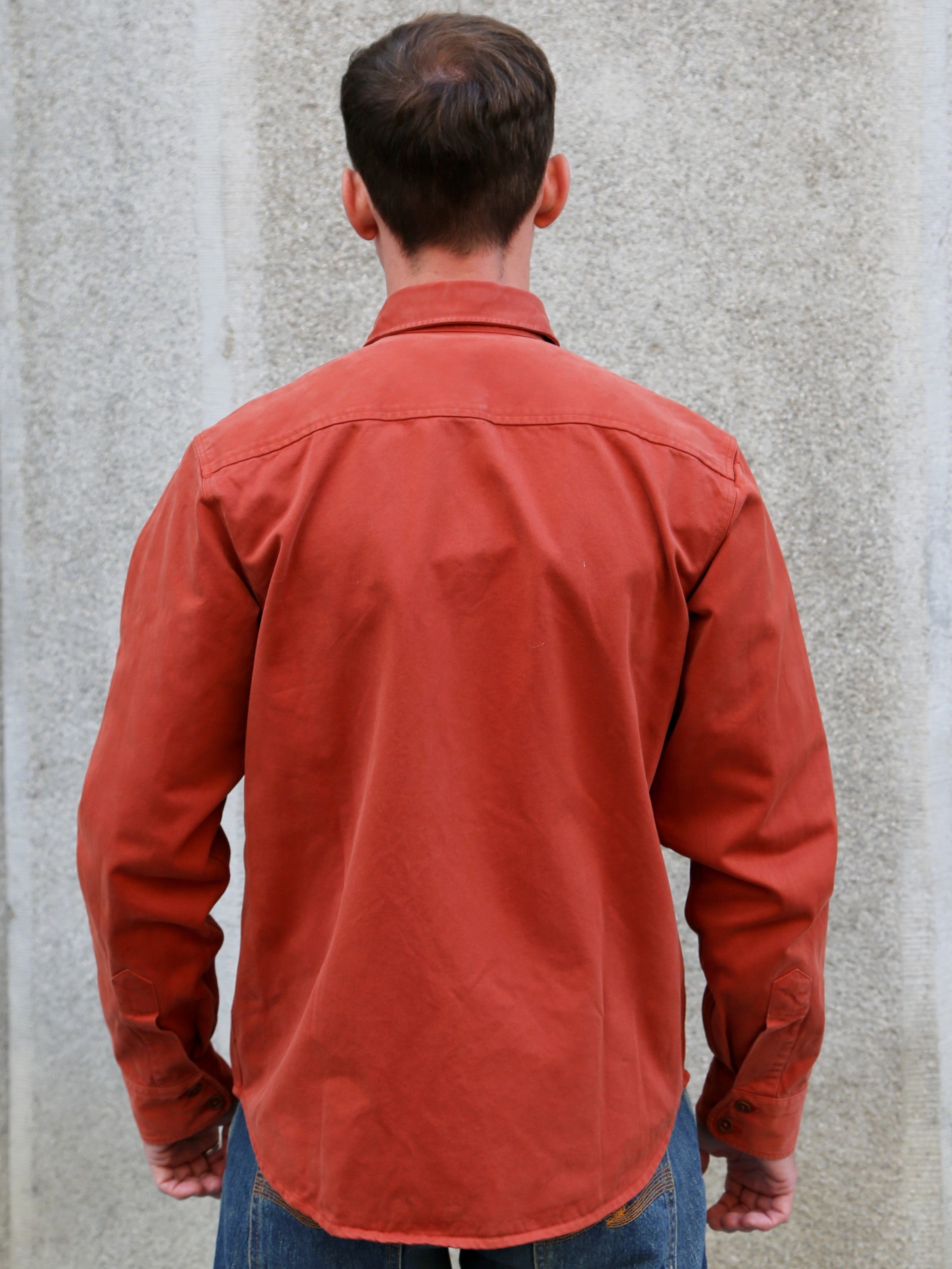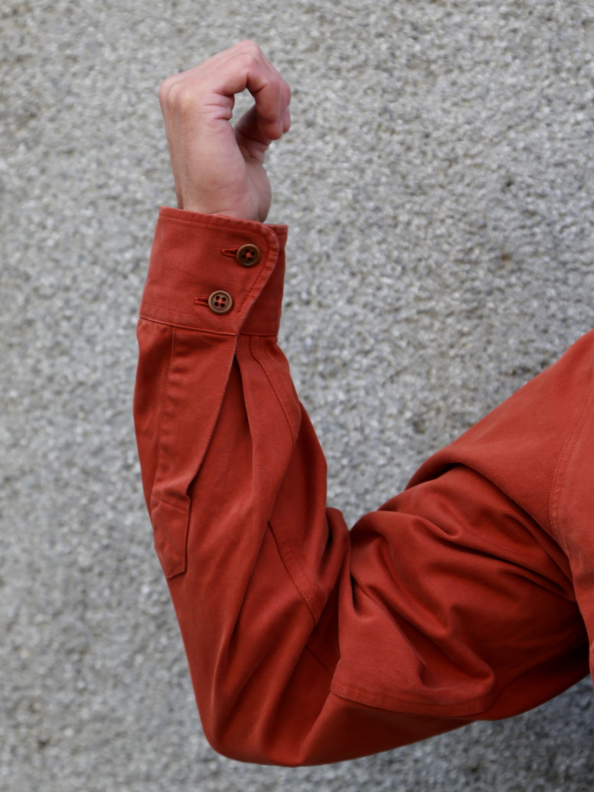 Clean design shirt in heavyweight cotton twill. Features two chest flap pockets and contrast brown button closure.