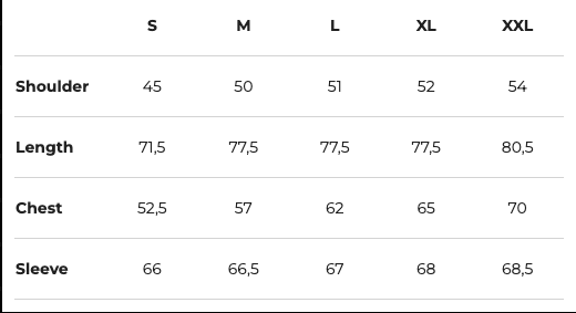 Pit to Pit: 59cmShoulders: 47cm Neck to Bottom: 76,5cm Sleeve: 67cm |