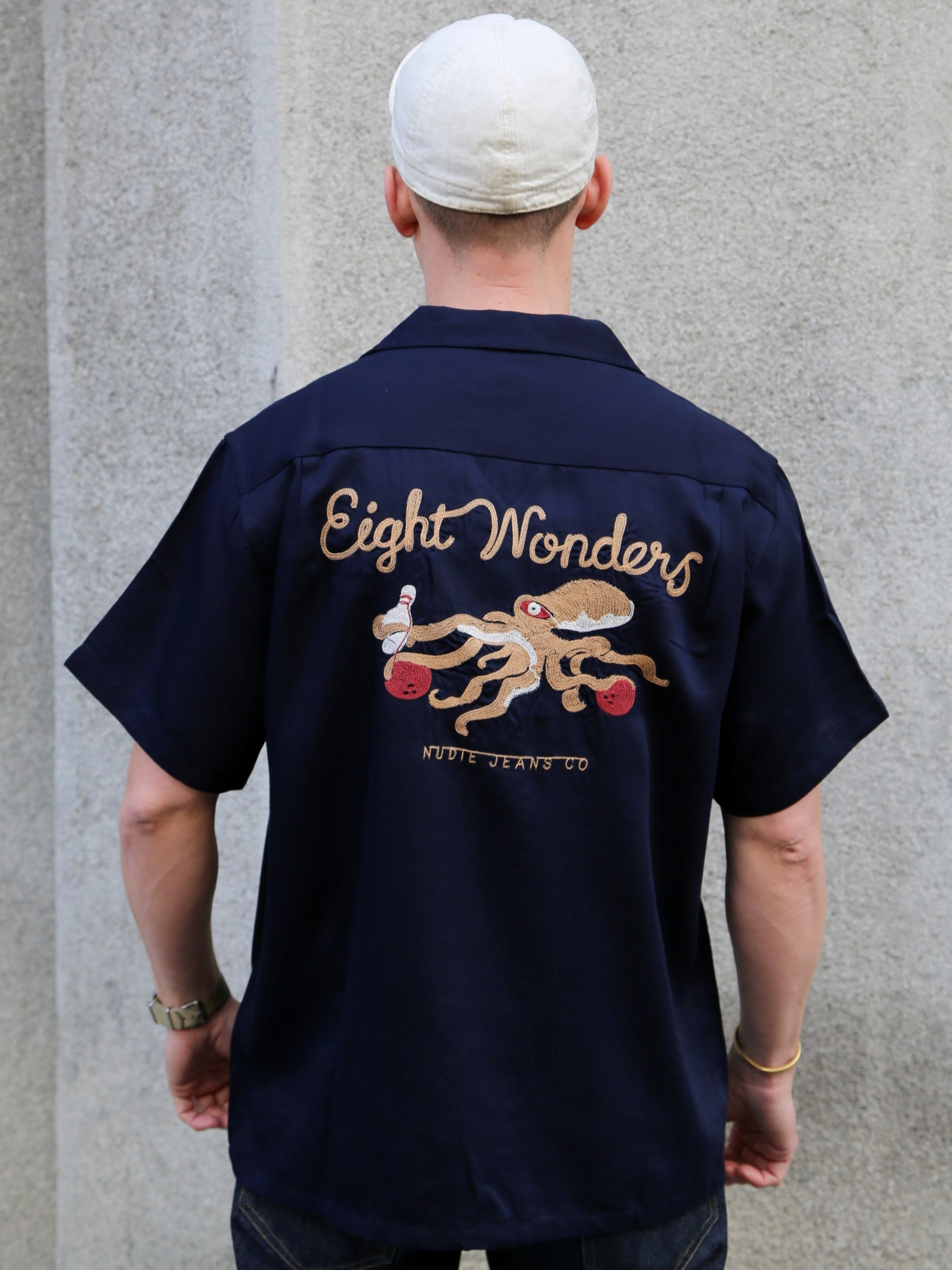 Bowling shirt crafted from soft, cool, and drapey TENCEL™ Lyocell in a deep navy color. Against this dark background, the beautiful chain stitch embroidery truly stands out. The Nudie Jeans logo is featured on the chest, while an octopus entangled in a bowling game adorns the back. This shirt features the classic camp collar and offers a loose, straight fit. Here's an inside tip. Instead of wasting time on ironing, just hang your Tencel garment in the bathroom while taking a hot shower and/or bath. Let the steam do the work for you.