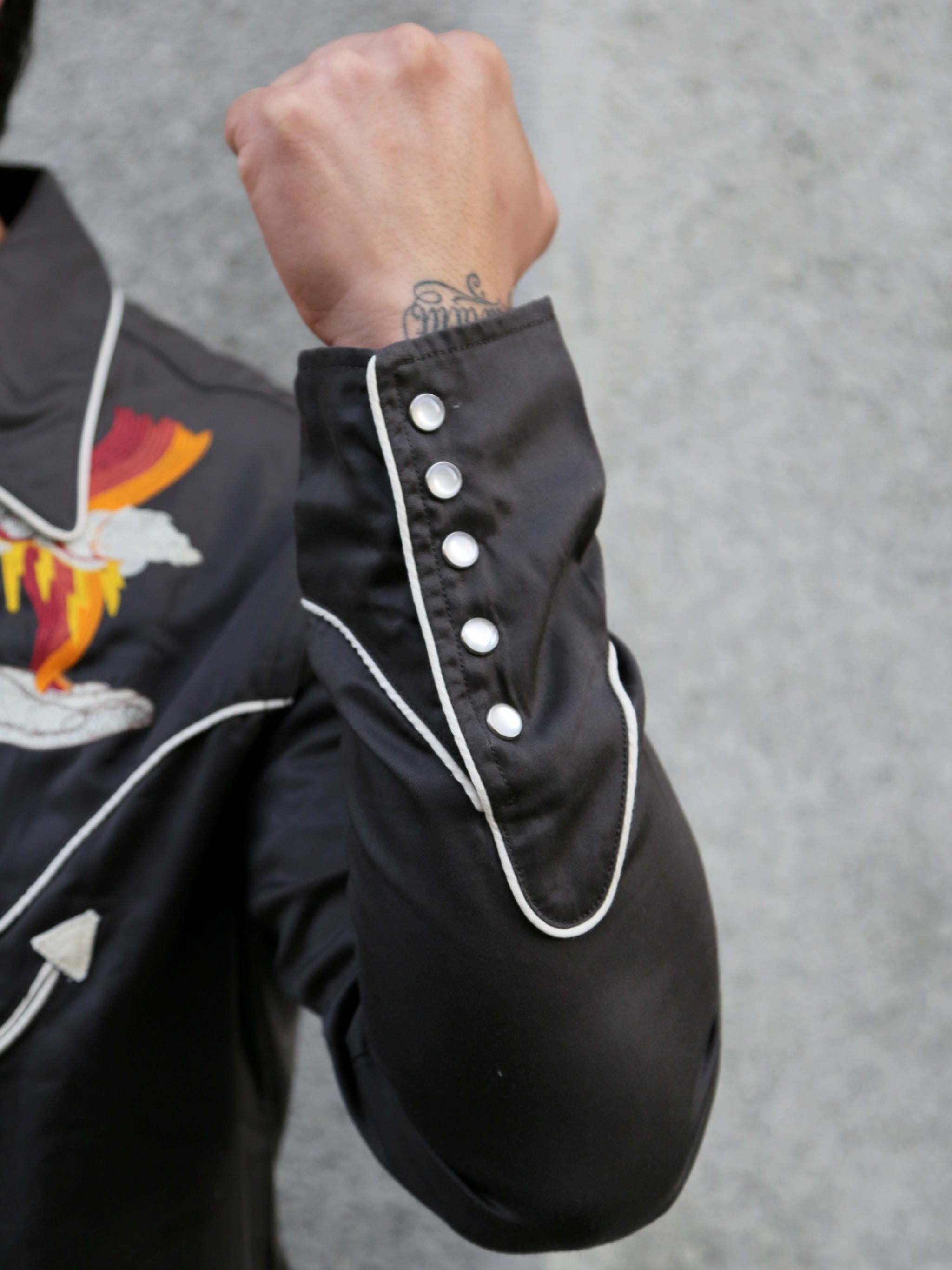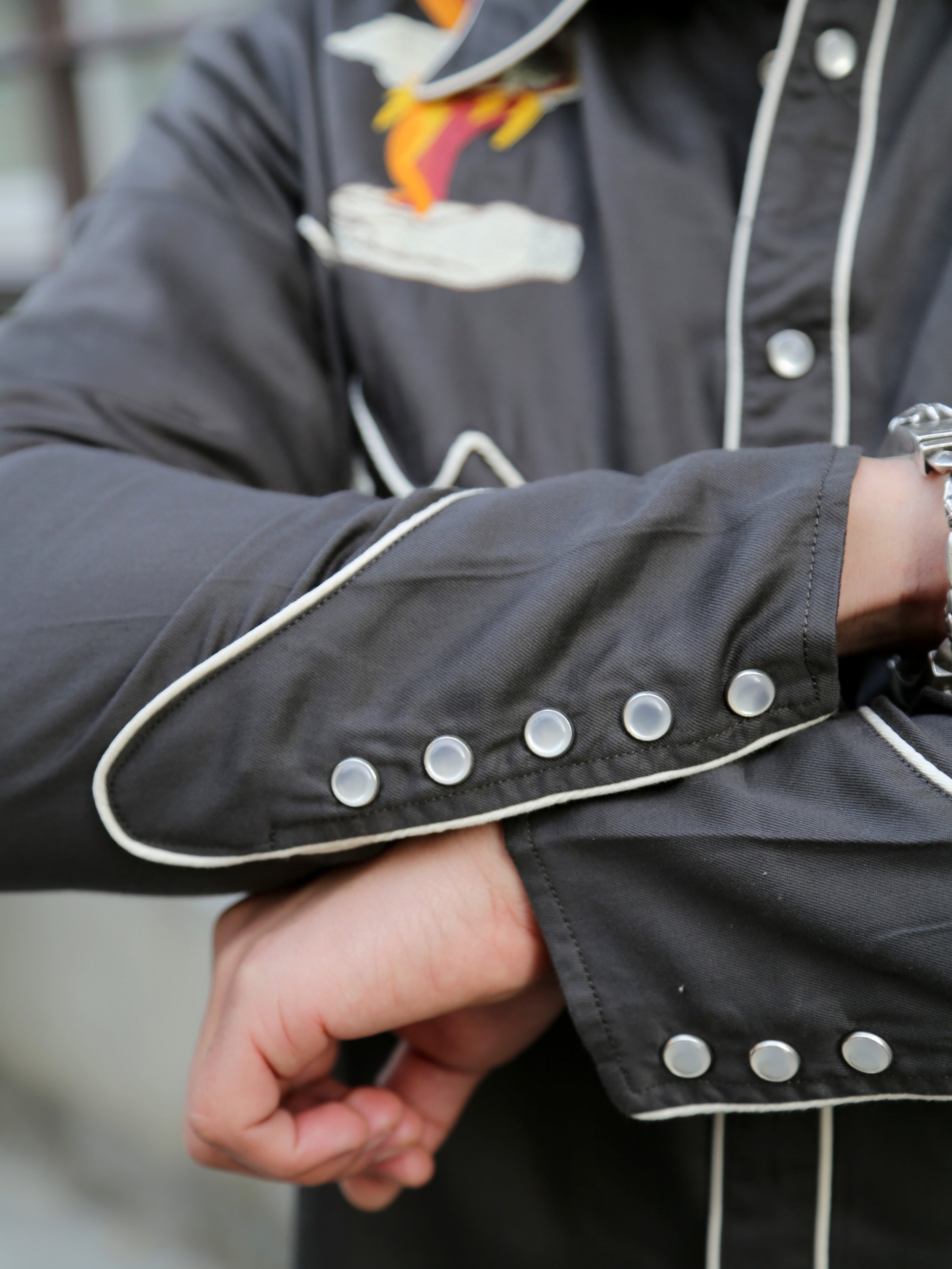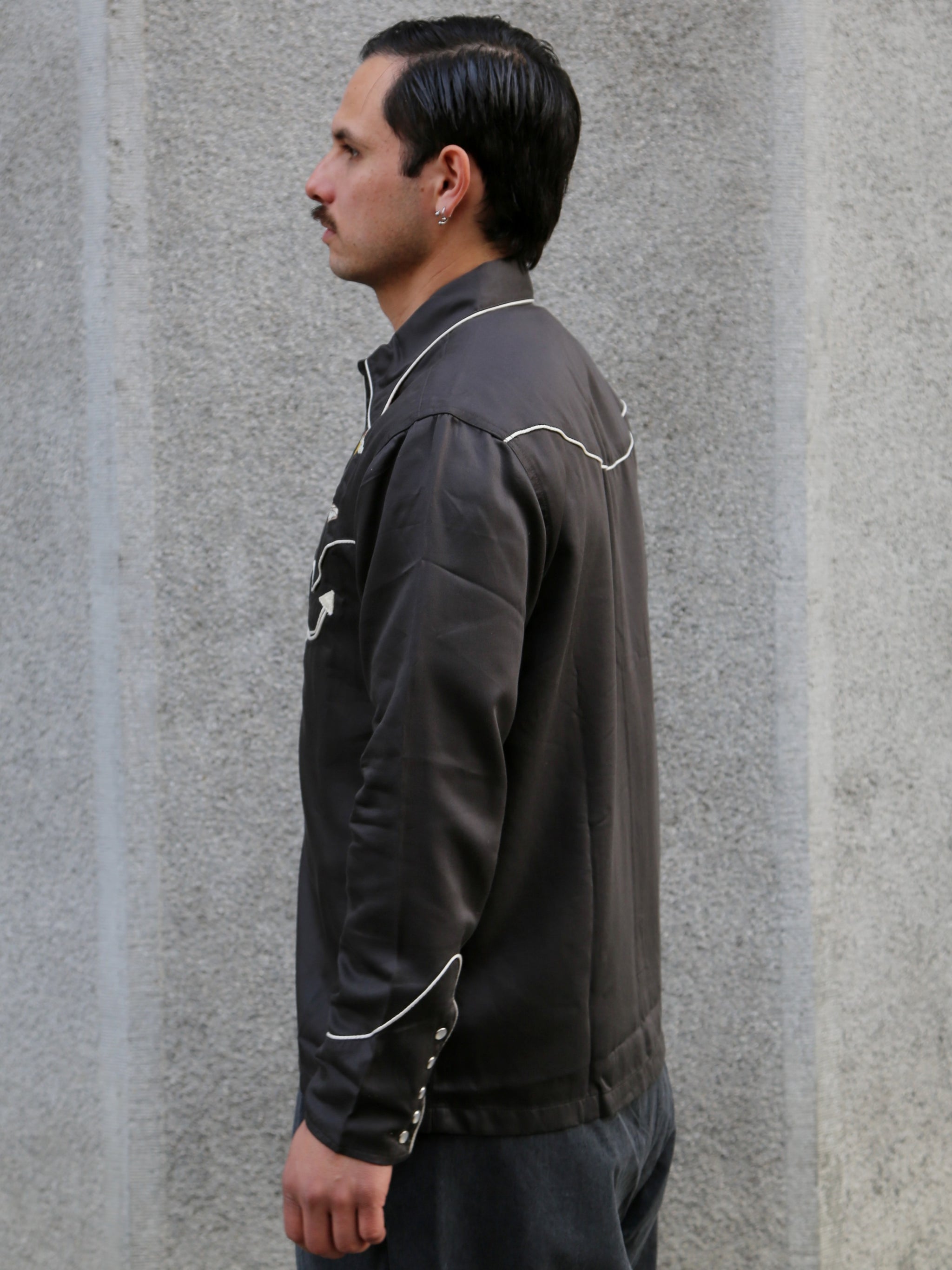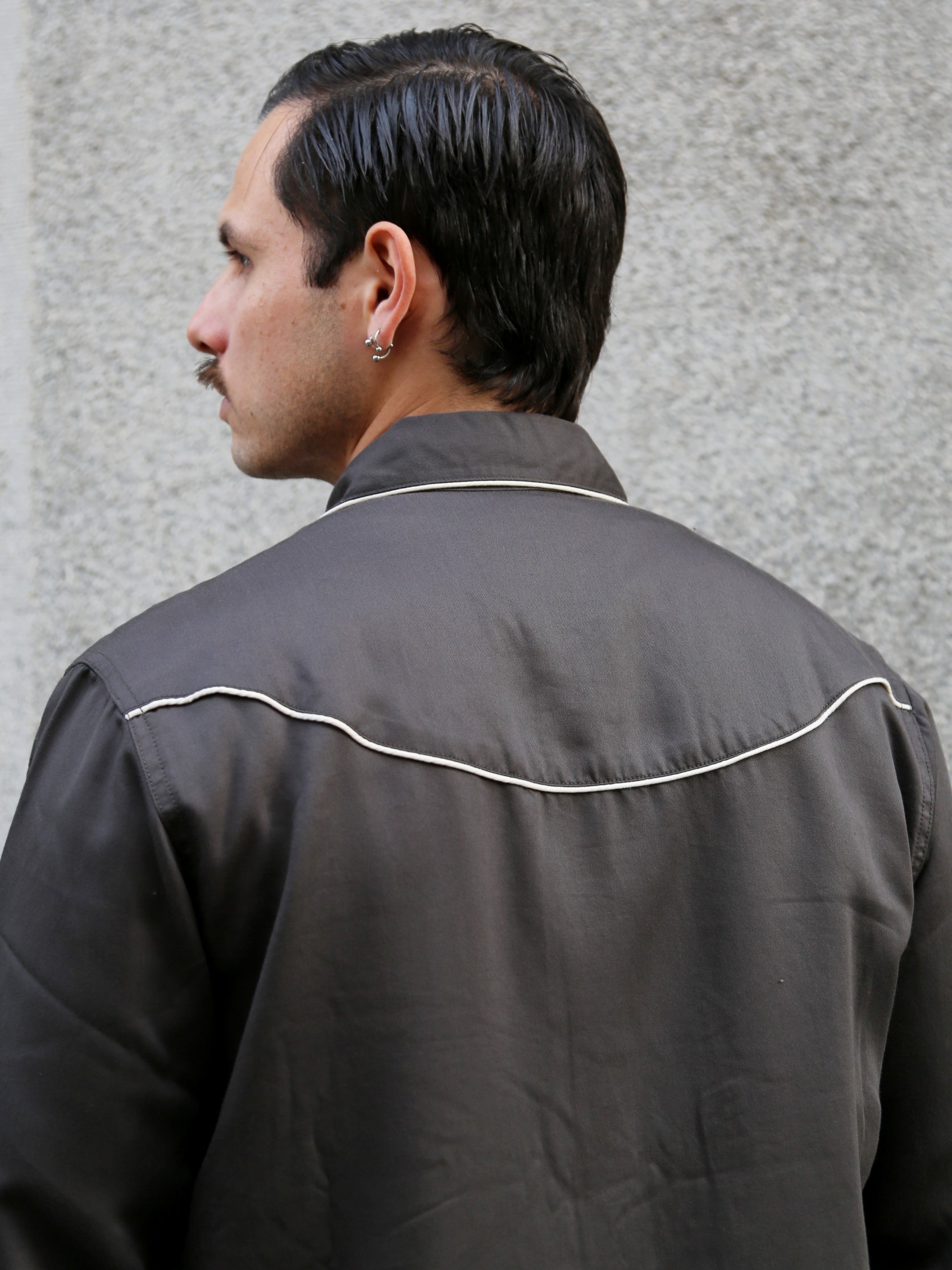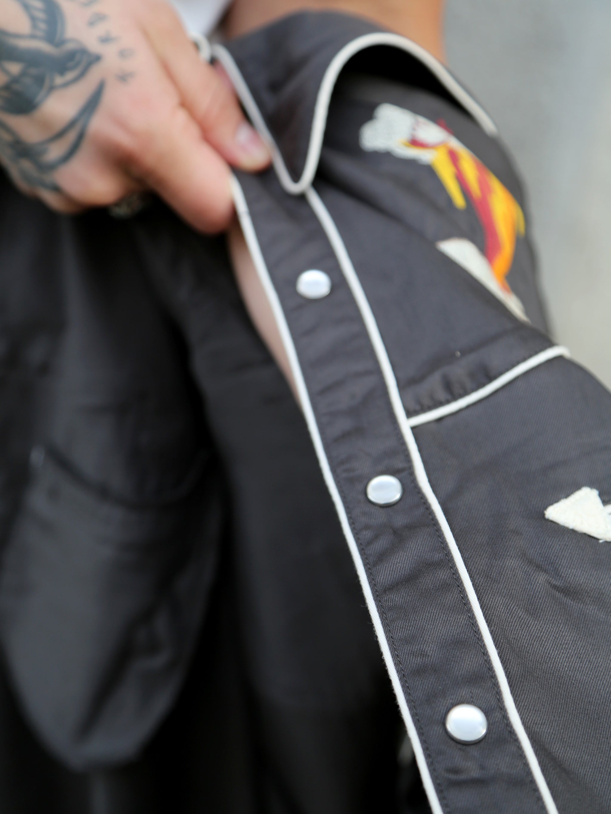 Western shirt crafted in cool, supple, and drapey TENCEL™ Lyocell. The front is adorned with beautiful vintage-style embroidery. It features piped chest pockets, piped seams on cuffs and yoke, and pearl prong snap button fastening.