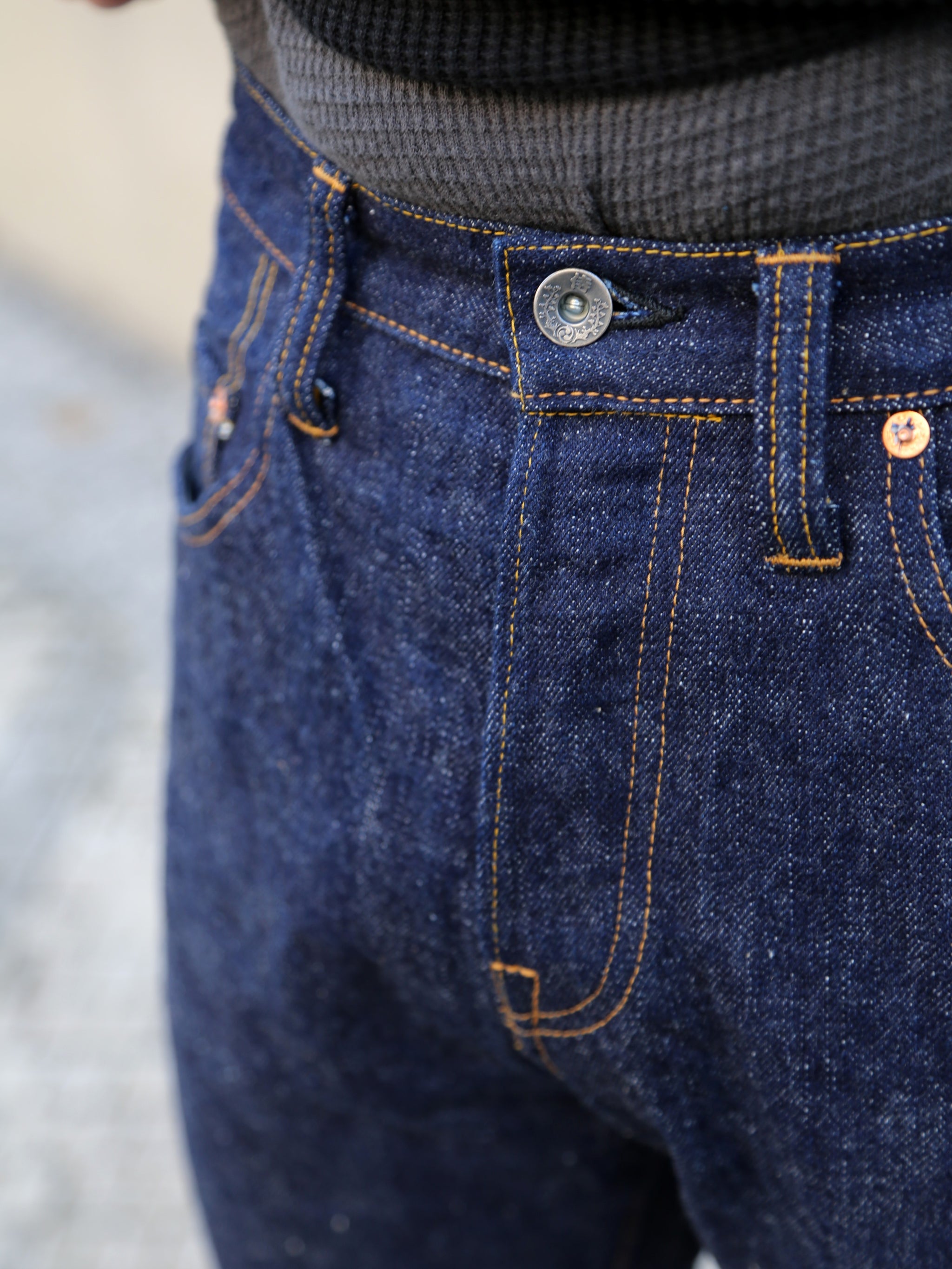 • Button fly with custom branded iron buttons, featuring the kanji for samurai and the mitsudomoe - a Shinto symbol associated with war