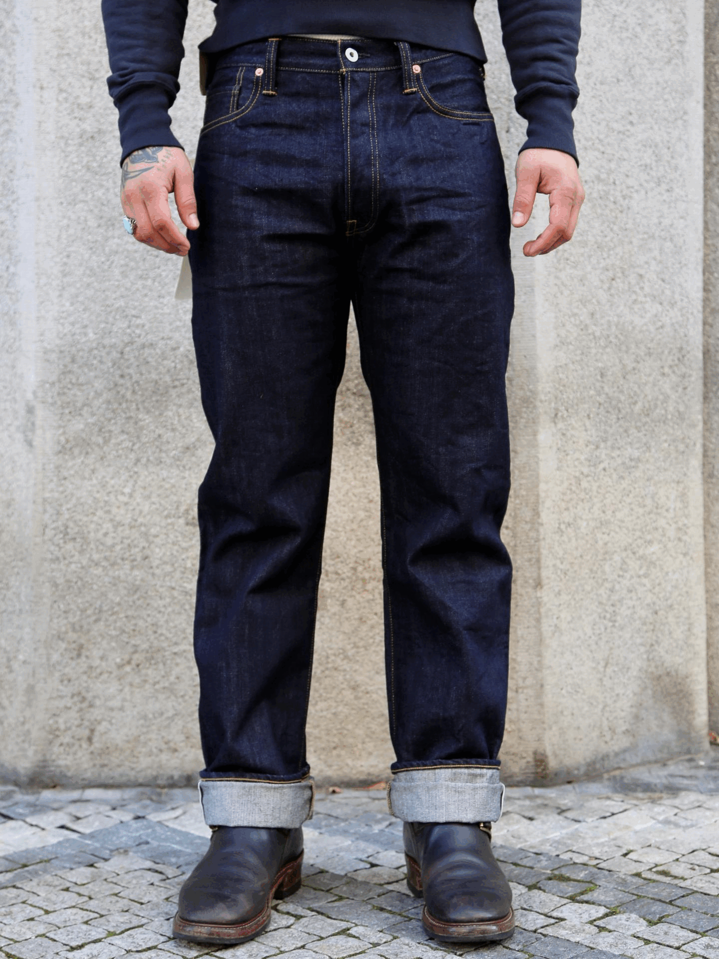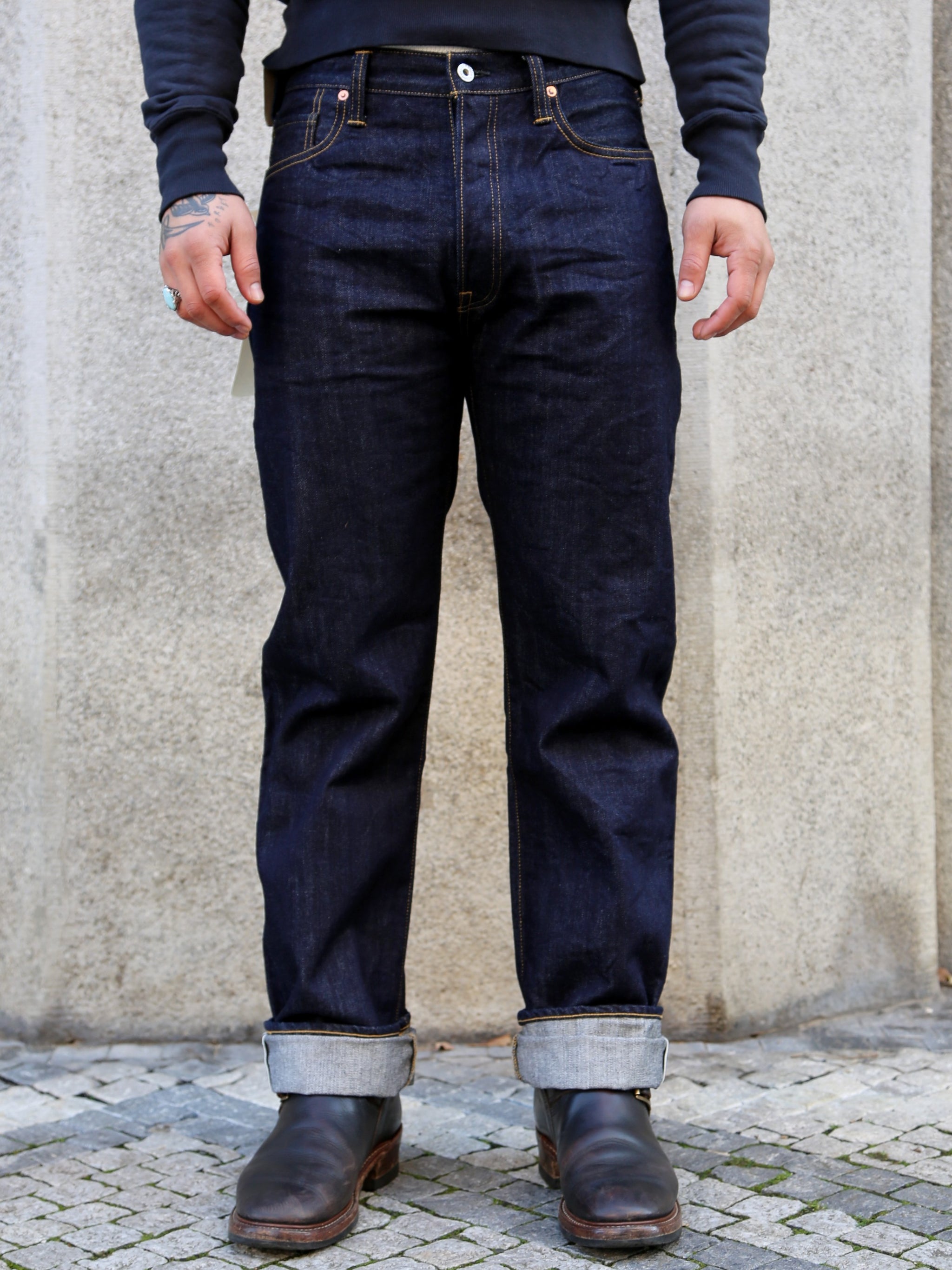 The Studio D'Artisan "Vietnam War" Selvedge Jeans are a reimagining of what a true "war model" might have looked like had it been produced in the 1960s. During World War II, strict material regulations led to the simplification of many products, including jeans. Factories repurposed existing stock fabrics and trims, while unnecessary details were eliminated to maximize efficiency. Skilled sewing craftsmen were drafted for military uniform production, leaving denim manufacturing in the hands of less-experienced workers. As a result, jeans from this era featured crude stitching and unpolished details.