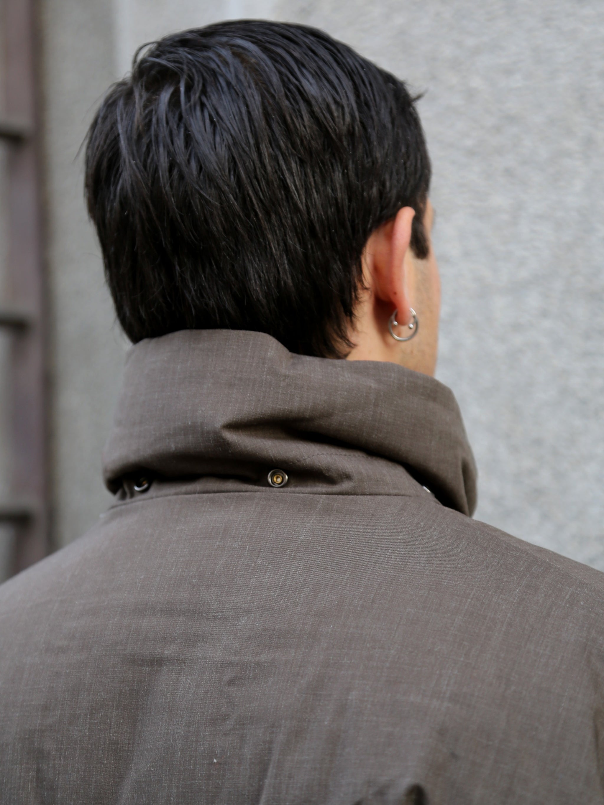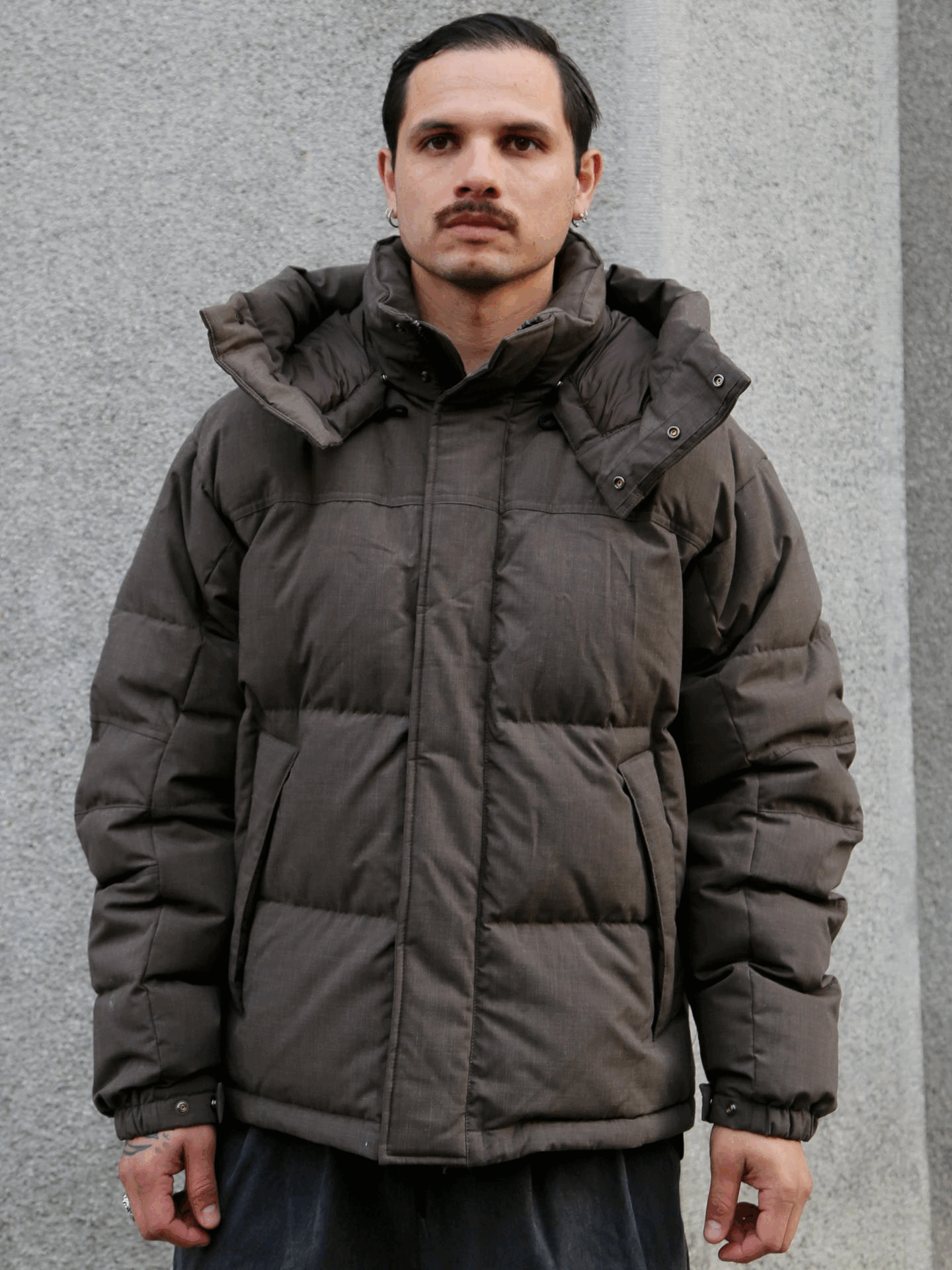 Ten C's Jay Peak Down Jacket represents contemporary outerwear craftsmanship designed for enduring wear. This dark olive piece features a detachable hood secured by snap buttons, offering versatile styling options. The relaxed silhouette combines a wool-blend TECHNO WOOL exterior with premium white duck down filling, delivering substantial warmth and cold resistance. Box quilting details echo vintage outdoor heritage while maintaining modern appeal. YKK VISLON zippers and custom metal snaps ensure reliable hardware, while the organic-textured fabric provides both durability and subtle stretch. A handwritten sealing wax tag and functional left-side liner pocket add distinctive character. Includes Ten C's signature garment case and hanger for proper storage and presentation.