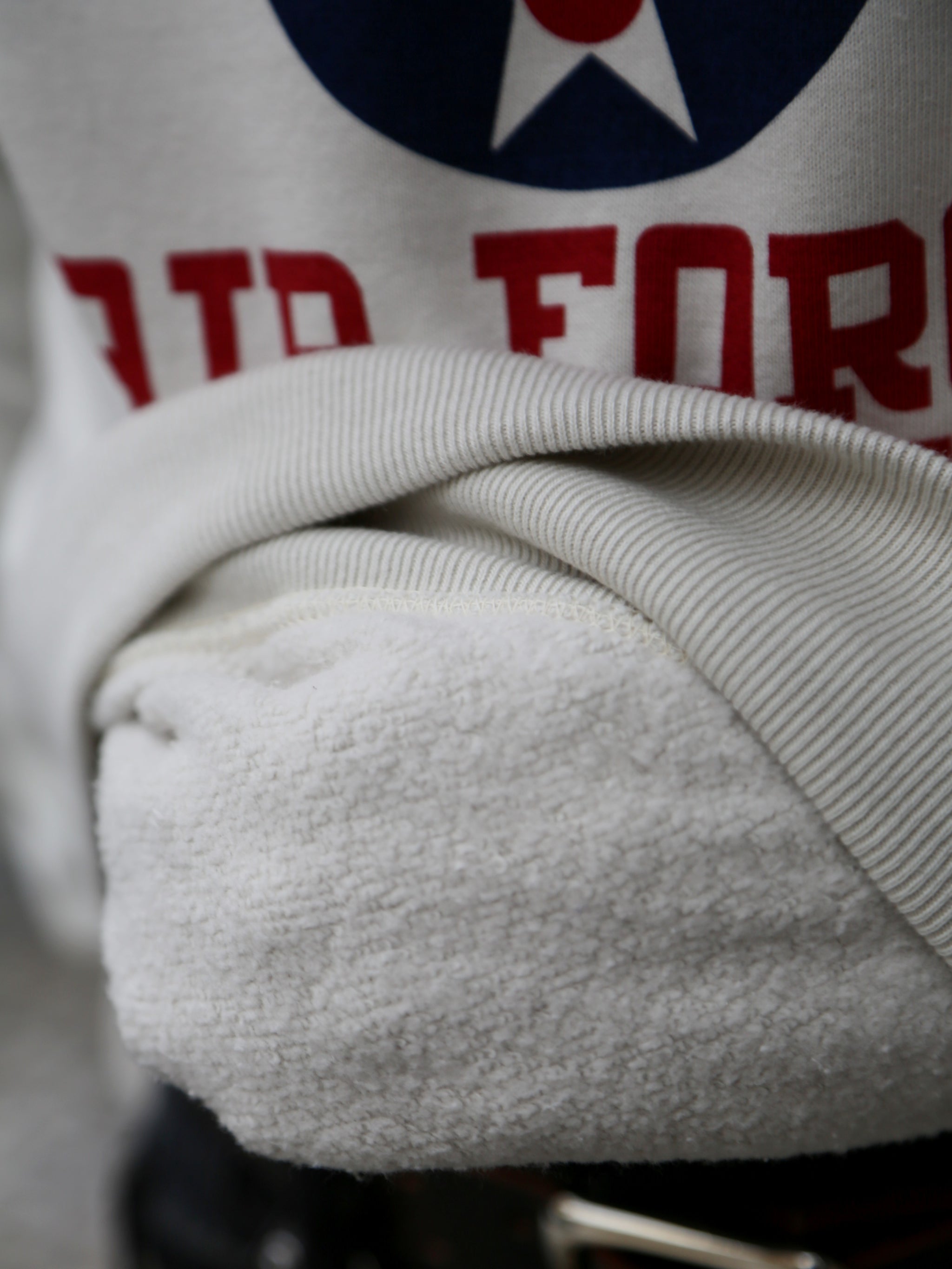 The blotchy borderline between the USAAF logo feathers and the background circle is reproduced using a unique technique just like those seen on vintage printed sweatshirts, giving the sweatshirt a more authentic finish by using a vintage production method.