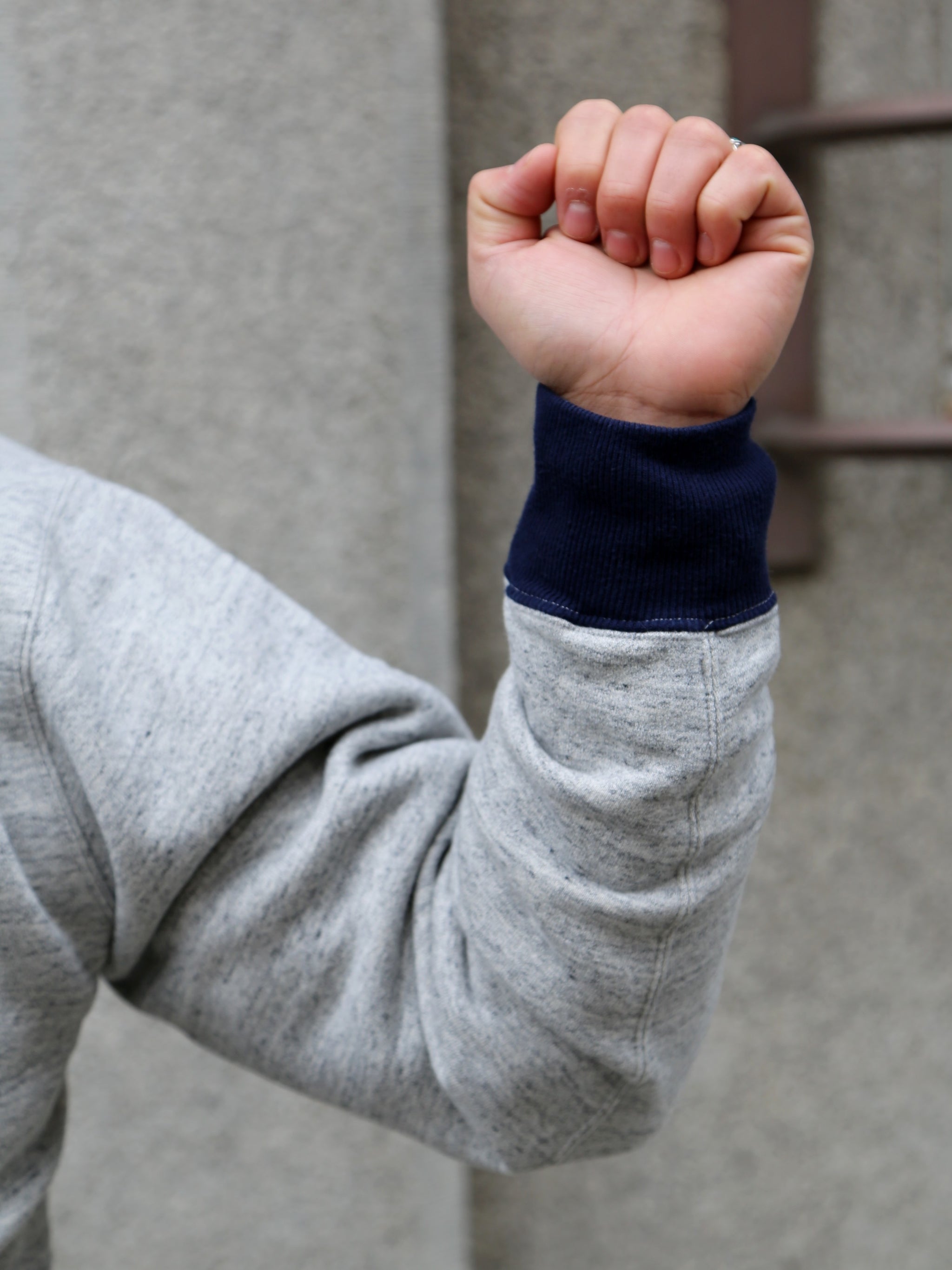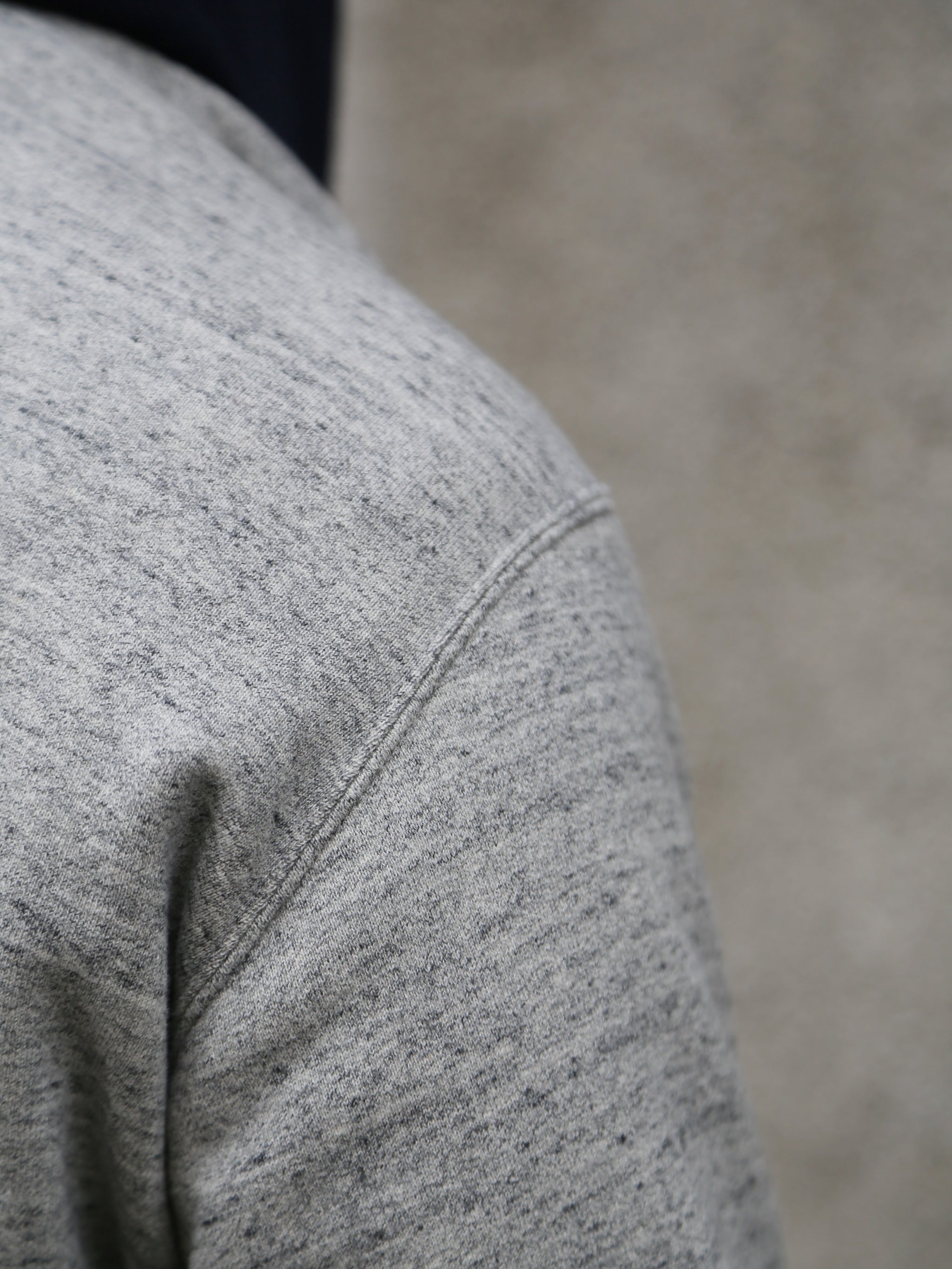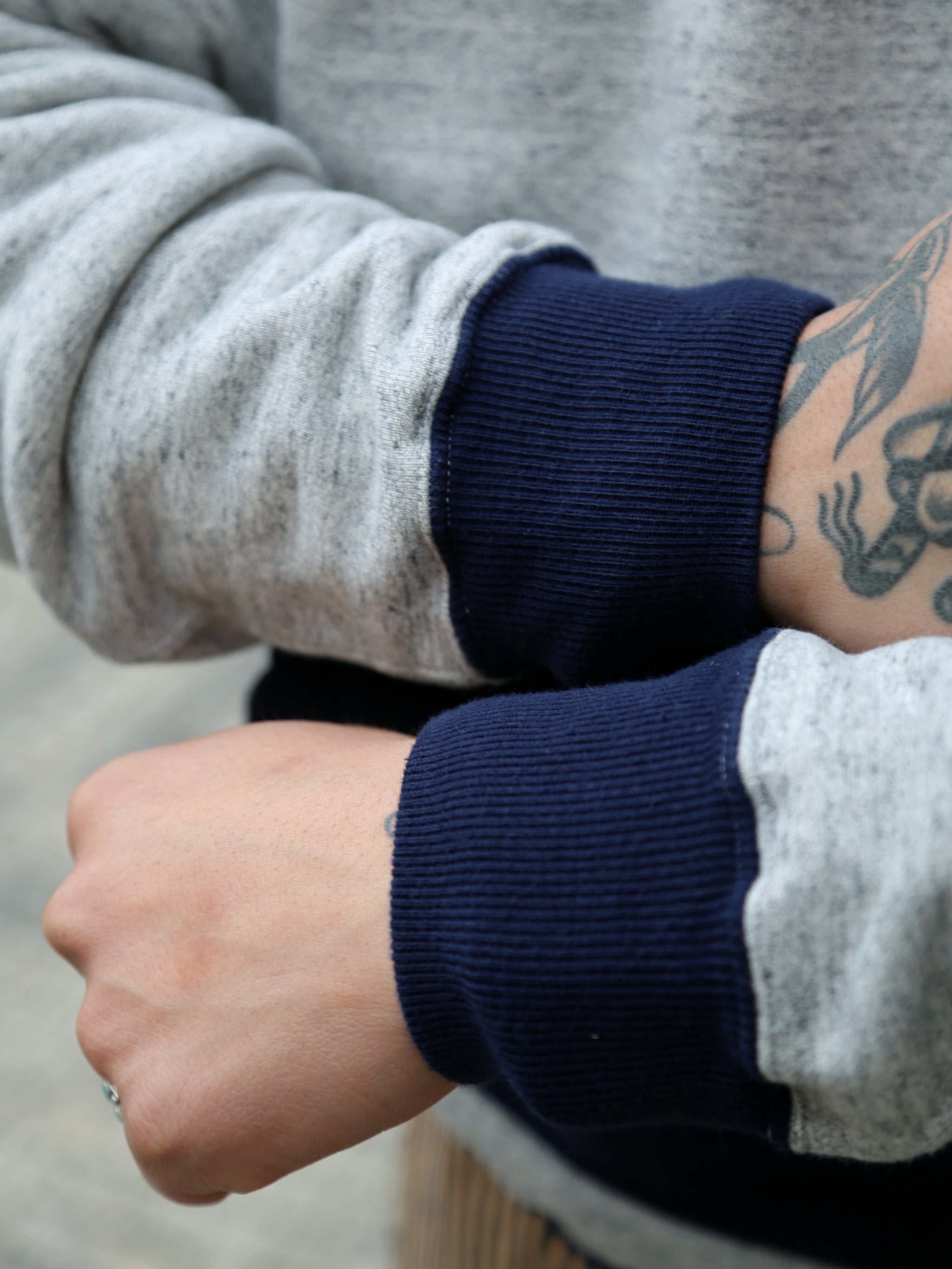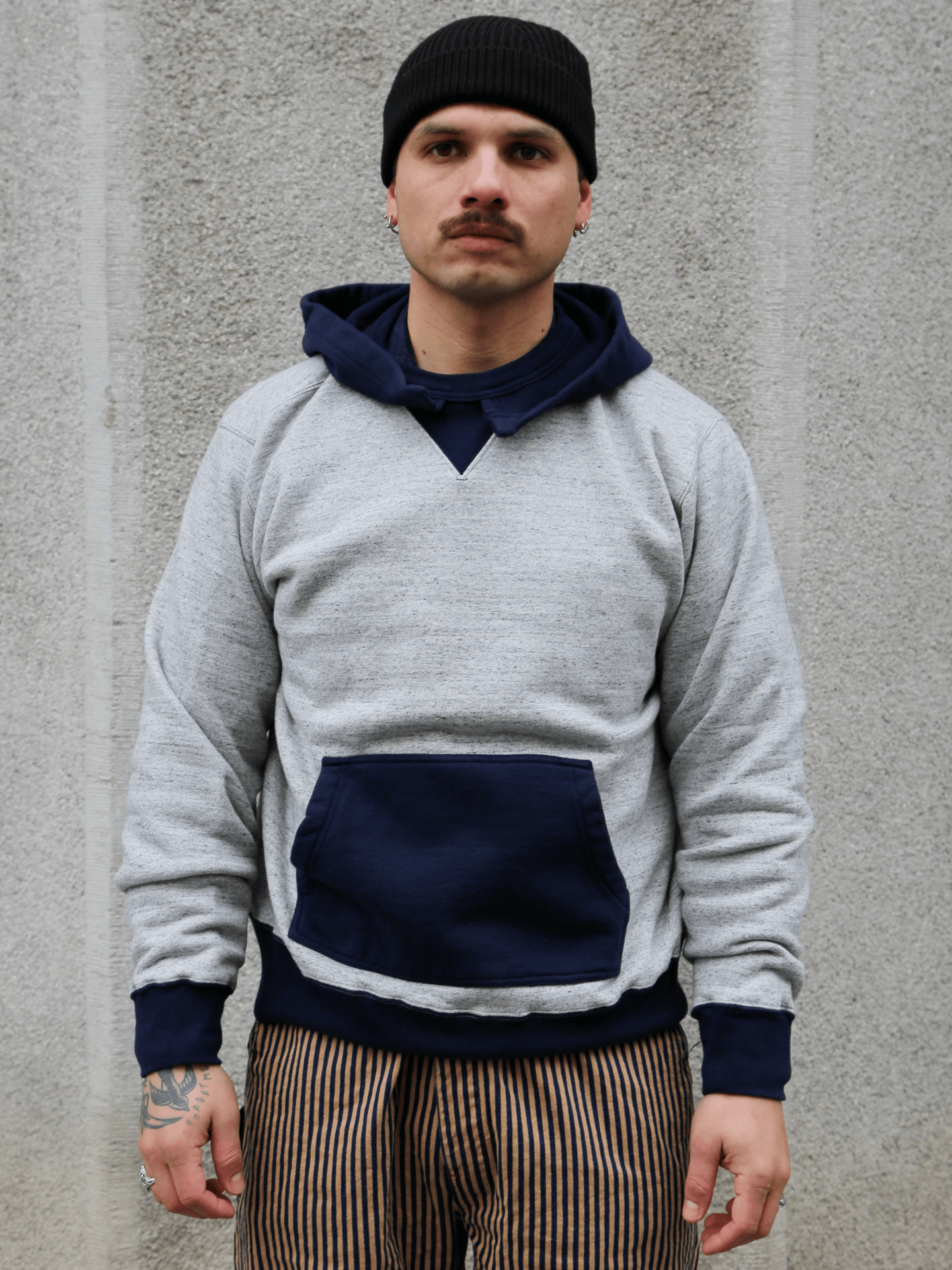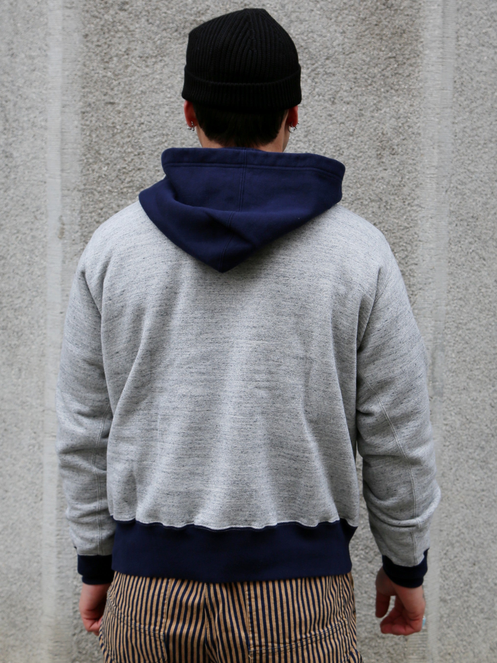This sweatshirt is inspired by the early history of sweatshirts when hoods were attached on regular sweatshirts. The two-tone color scheme is another time typical detail added for further vintage goodness. Whitesville have knitted these on original 4-needle 1920's vintage loopwheel machines in Japan. The facility that makes these knits is one of the last ones in the world to maintain and keep these looms in working order. 4-Needle looms are special machines that are able to knit a perfect tube, but they can only knit a set diameter. In other words, one loom for each size is required and this is why one hardly ever sees perfect tube construction in modern day garments. This special way of sewing allows to create sweatshirts without side seams, a technique that ensures that the true shape of the garment is maintained not only during its construction but also during its life of wear.