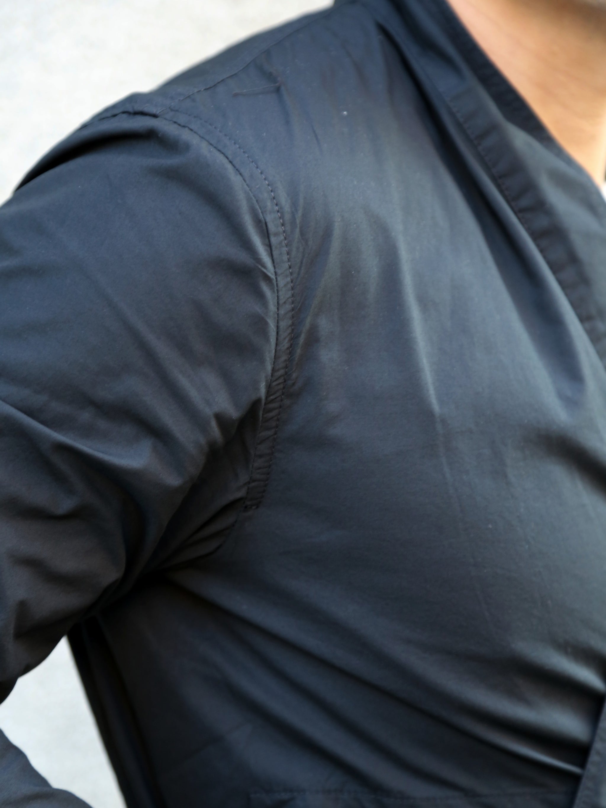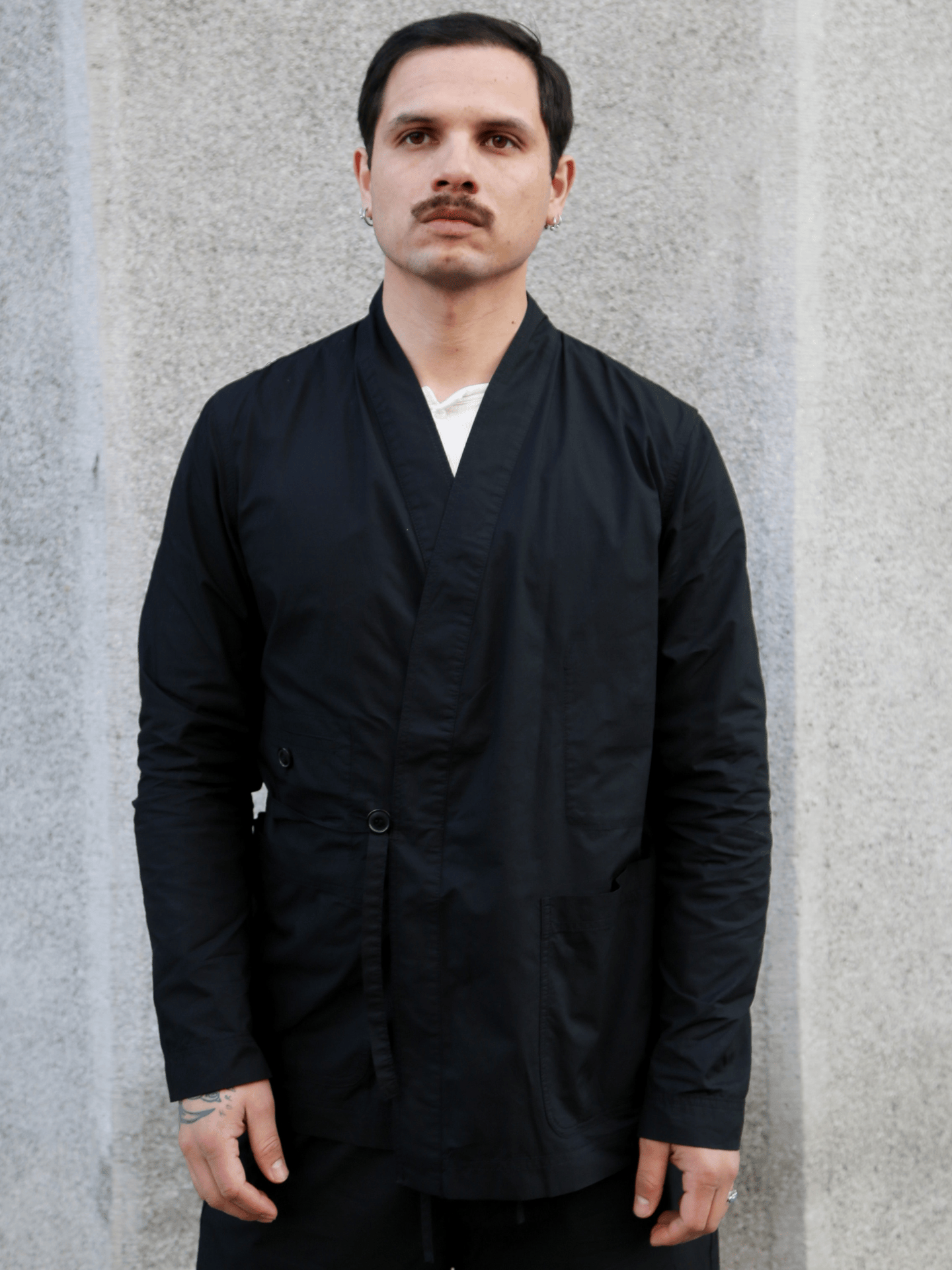 FOLKE is a loose fitting Asian work-wear inspired jacket that can be closed in several ways. There are two flat-string loops, one for each sides of the jacket; also there is the option to close the front part with a button. It has two large front patch pockets, one smaller buttoned welt front pocket, two inner pockets and a single back vent.
