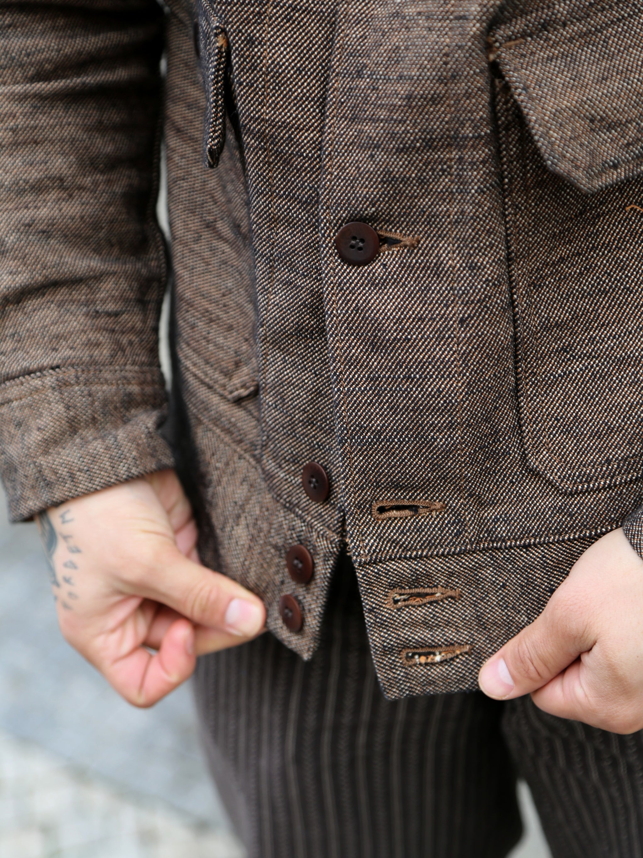 A flight jacket made of plain flannel fabric woven in Niigata Prefecture, where yarn-dyed textiles are produced. Flannel fabric woven in this production area is said to have a thick yet soft texture due to differences in the background, such as the threads used, dyeing, and weaving. The warp and weft threads are extremely thick enough to be used in heavy ounce denim. The warp threads are made into twin threads to increase strength, and the weft threads are made of slab threads to create a rough texture. Also, although it is made of cotton, the finished fabric is lightly brushed to bring it closer to the expression of a wool surge.