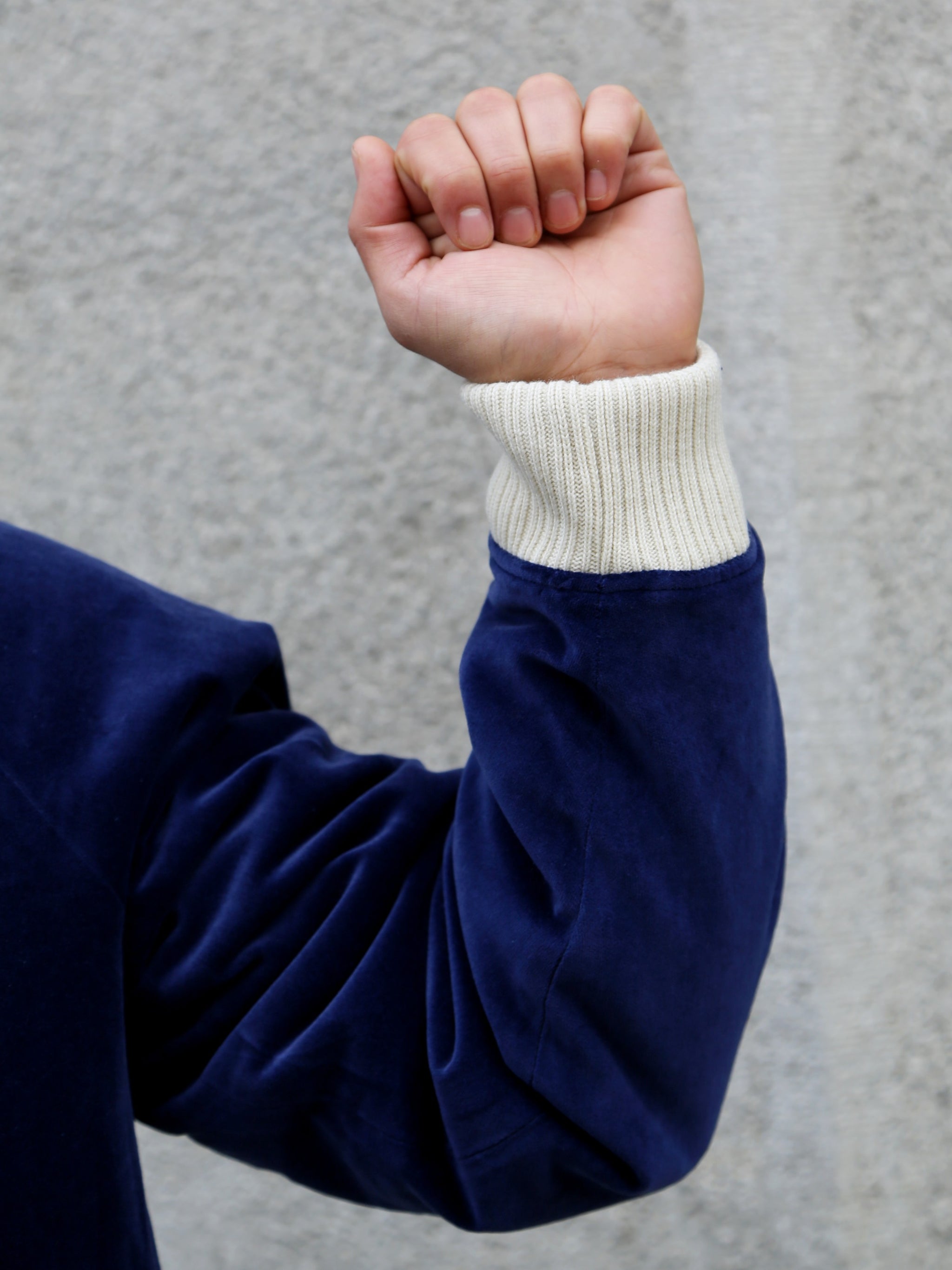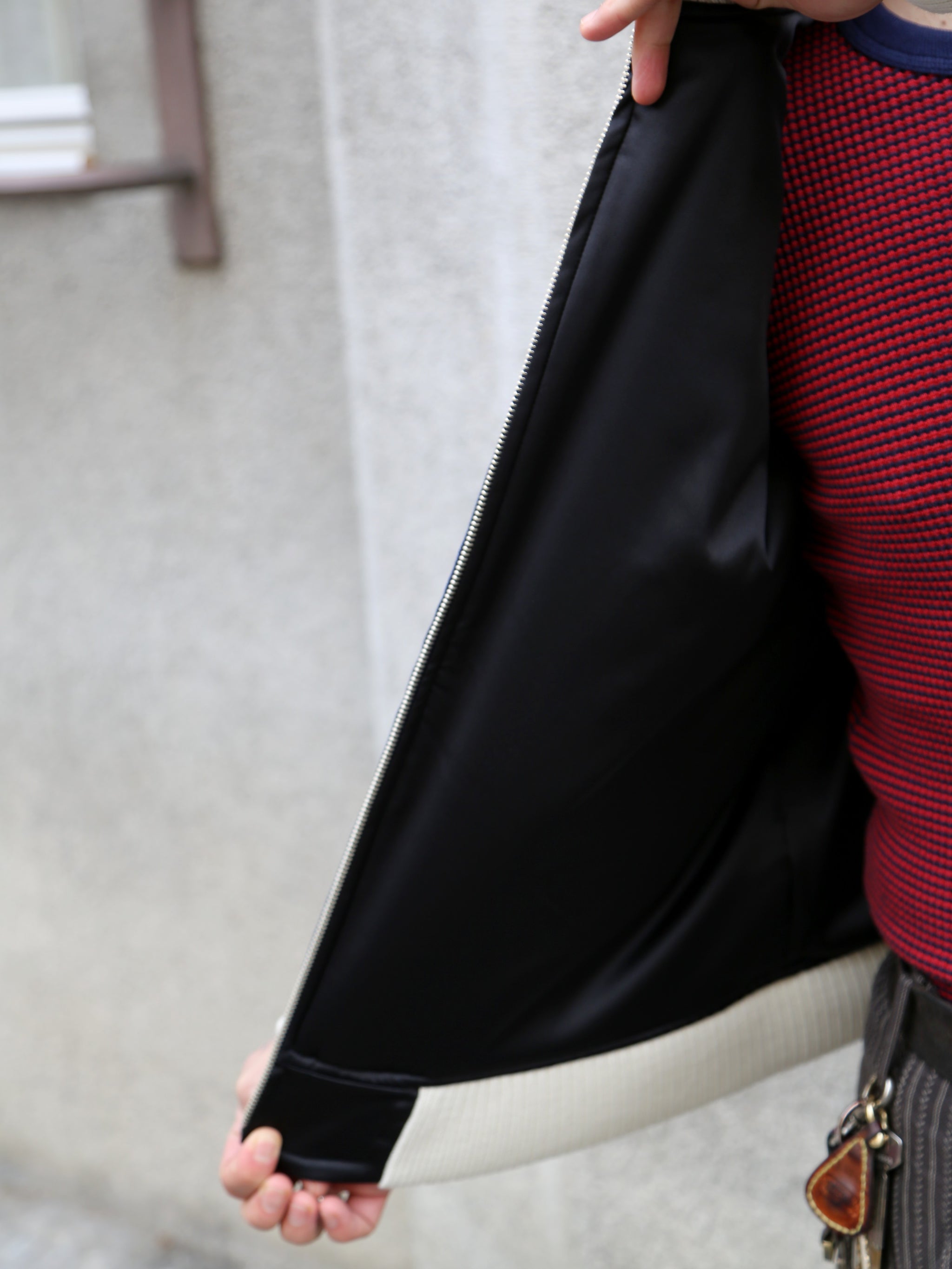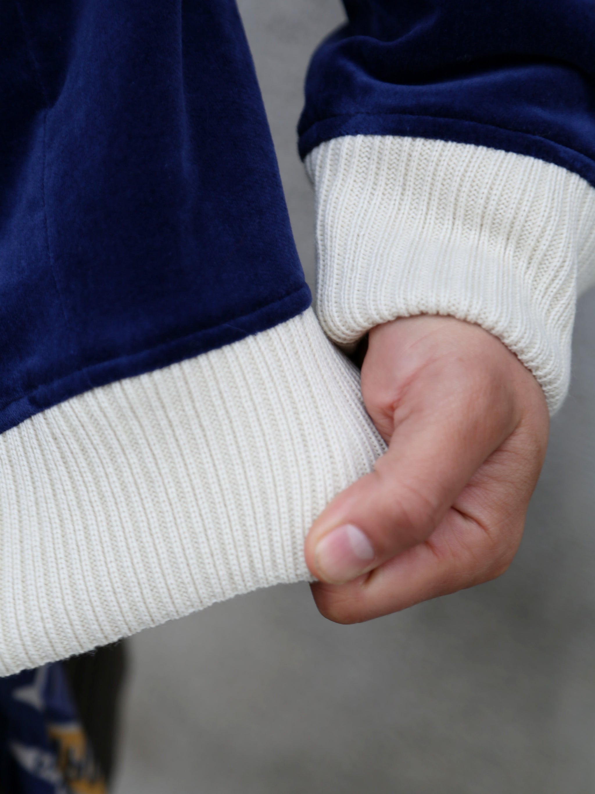 Sukajan made from a unique fabric. The fabric is cotton 100 % velveteen fabric dyed indigo color. Considering the dye transfer, Samurai dyed it in indigo color using a special method that causes less color fading (not indigo dye). The back is made of black satin with a thin filling. Based on the famous composition centered around skulls that can be seen in vintage models, the design is typical of a samurai, with a skull wearing a helmet and a dragon holding a sword or gunbai. The embroidery is made from molds from actual hand-wielding embroidery, giving it a very atmospheric finish. Rib parts are also custom knitted.