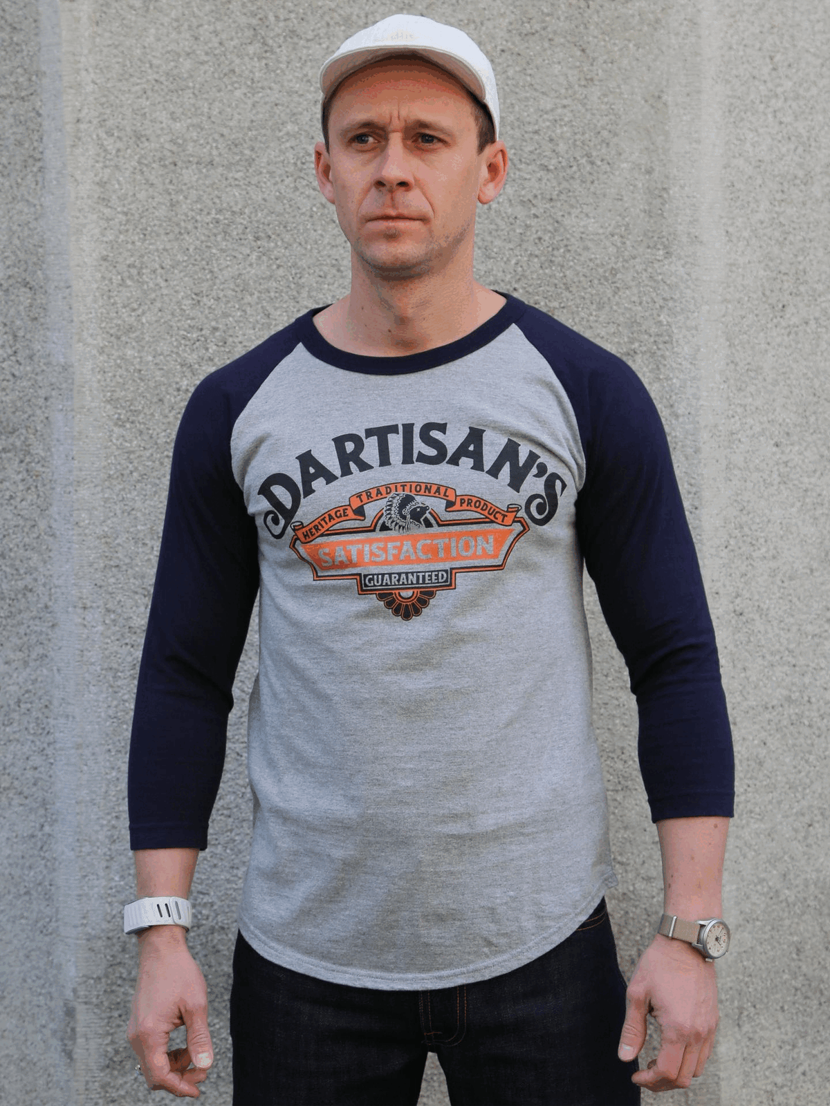 This is a classic raglan 3/4 sleeve T-shirt with a biker-style design on the front only and a funded hem. Of course, it is made in Japan with Studio D'artisan's commitment.