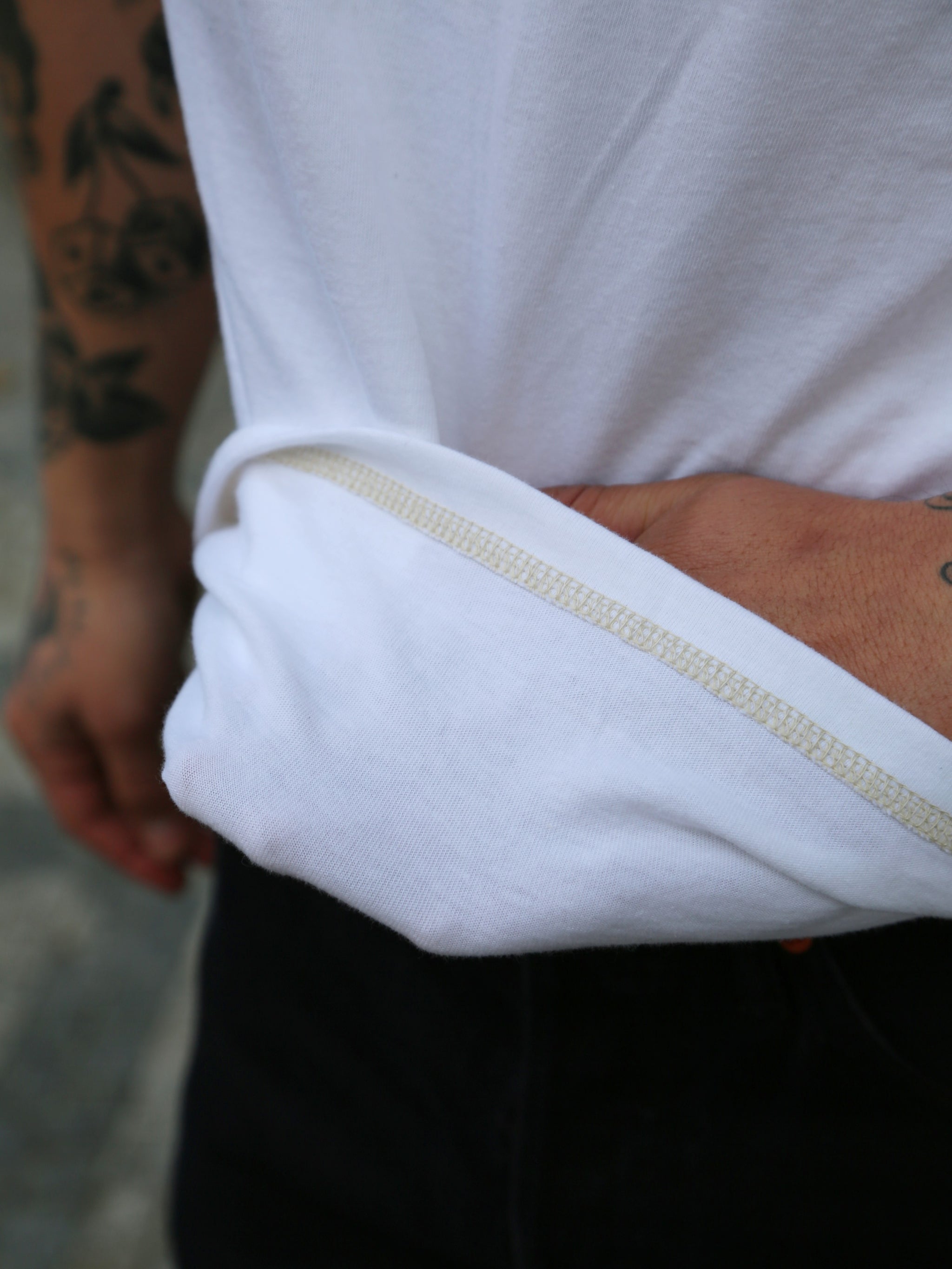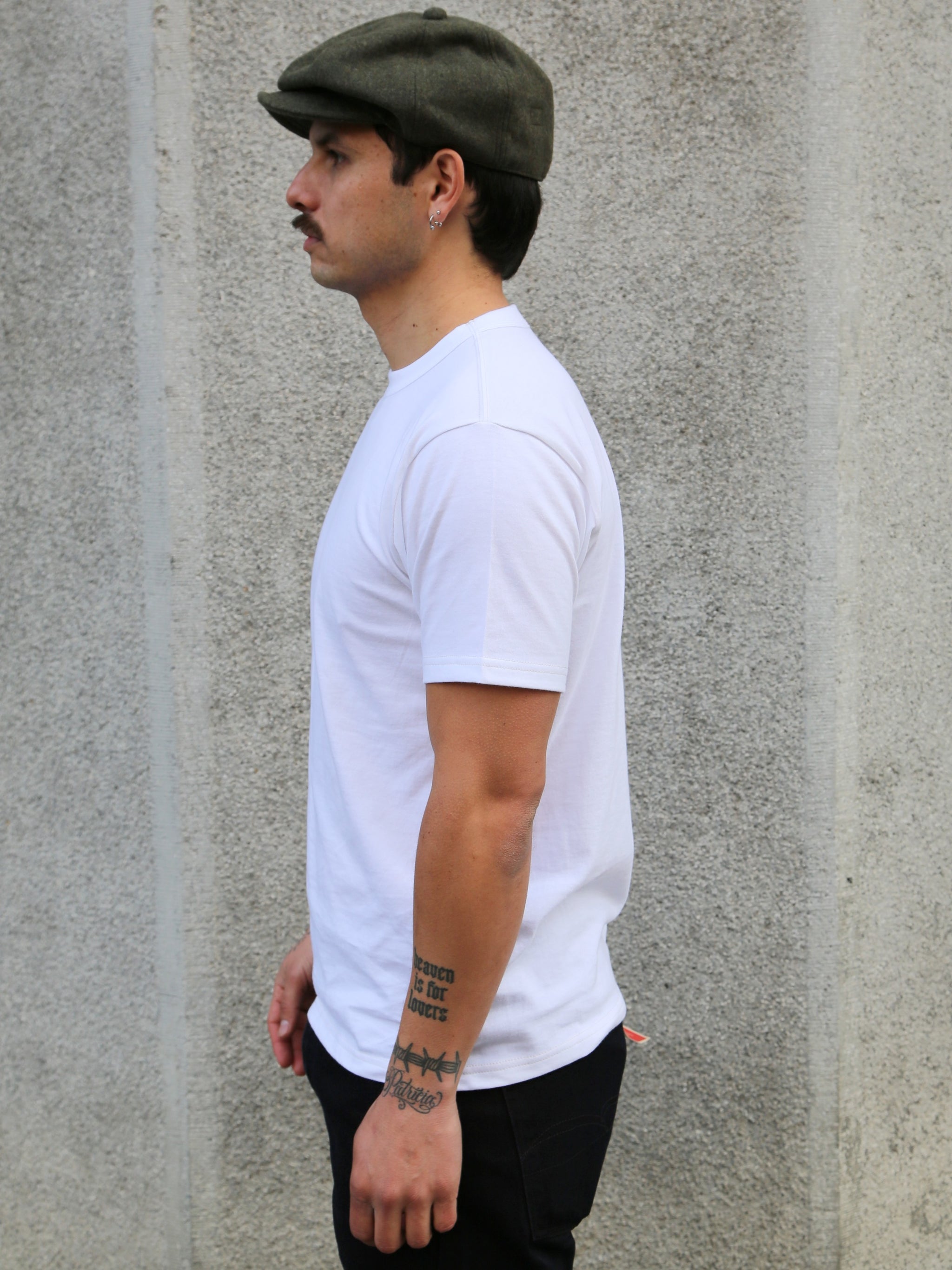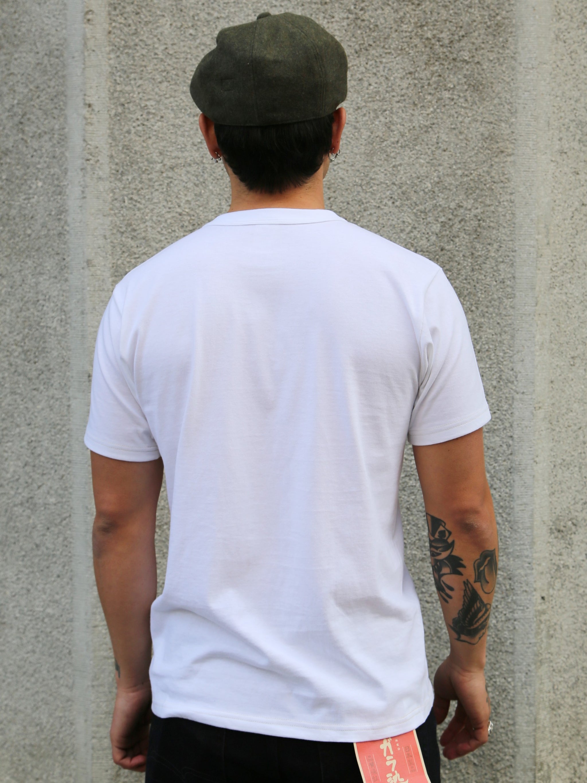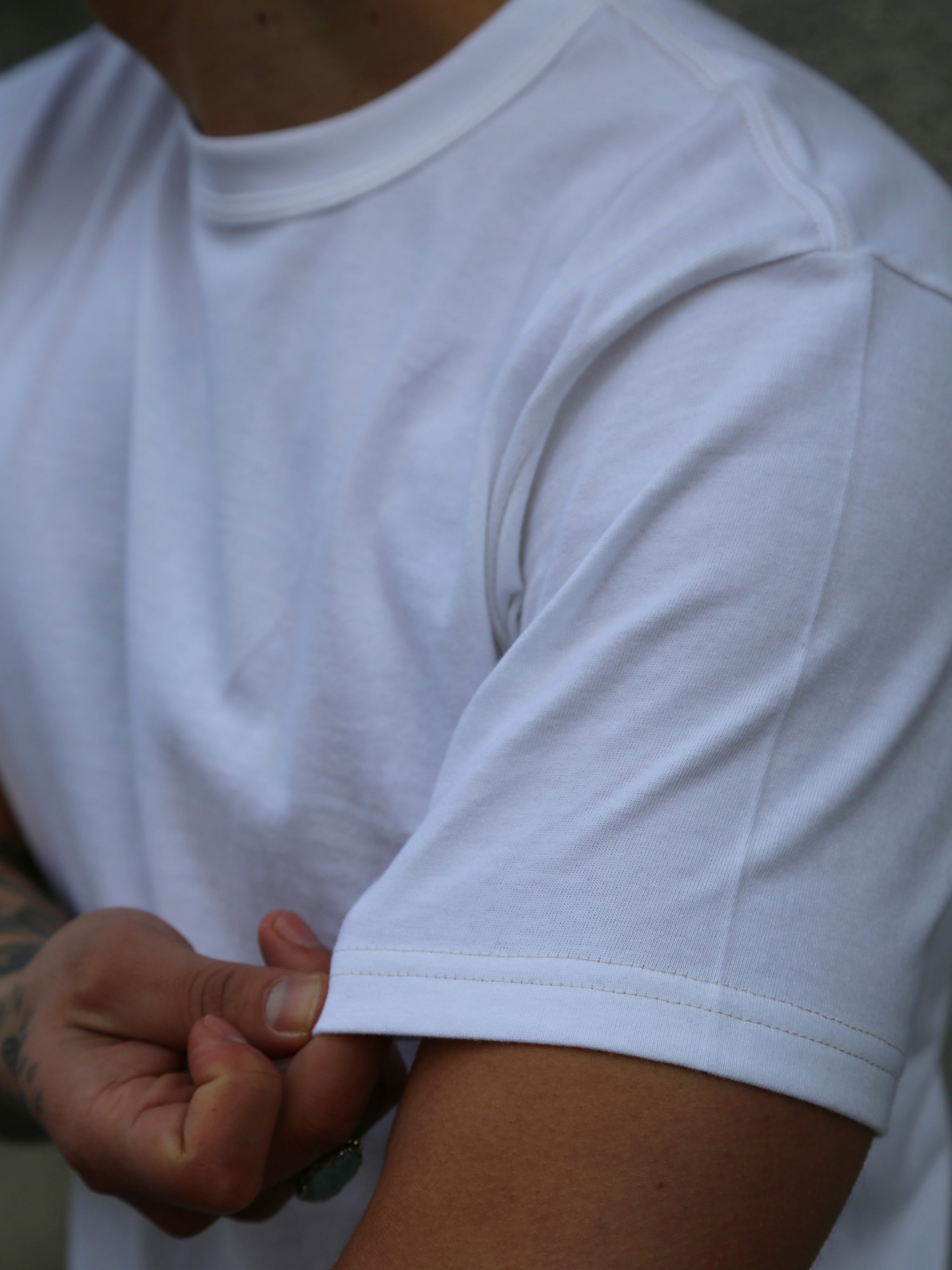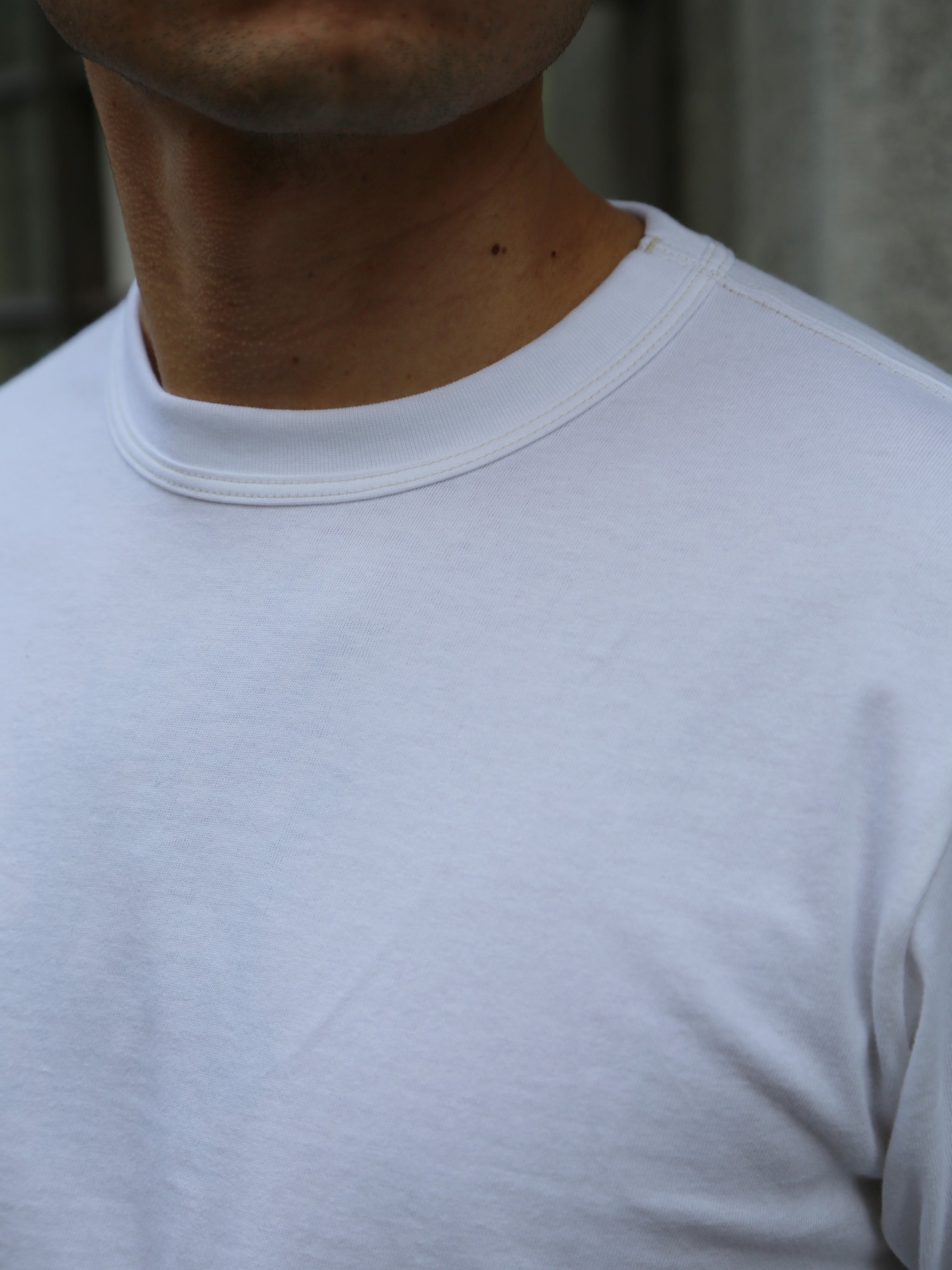 2-Pack Tees from Whitesville is an item reminiscent of the American-made Pack T from the good old days. For the fabric, they use a high-quality thread called combed thread. Removing short fibers to make the thread uniform increases labor and cost, but it also reduces thread unevenness, increases gloss, and increases strength. By knitting the combed thread into a round body, it creates a tough, supple and wonderful comfort. All sewing threads are made of cotton. The shoulders, sleeves, and hem are sewn with two needles, and the neck is made with a double binder, which helps prevent it from losing its shape and stretching. Items to wear every day. Therefore, comfort and durability. Because it's a simple item, subterfuge won't work.